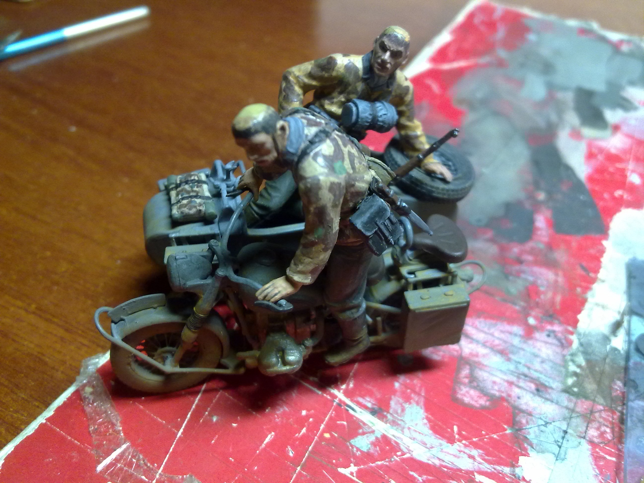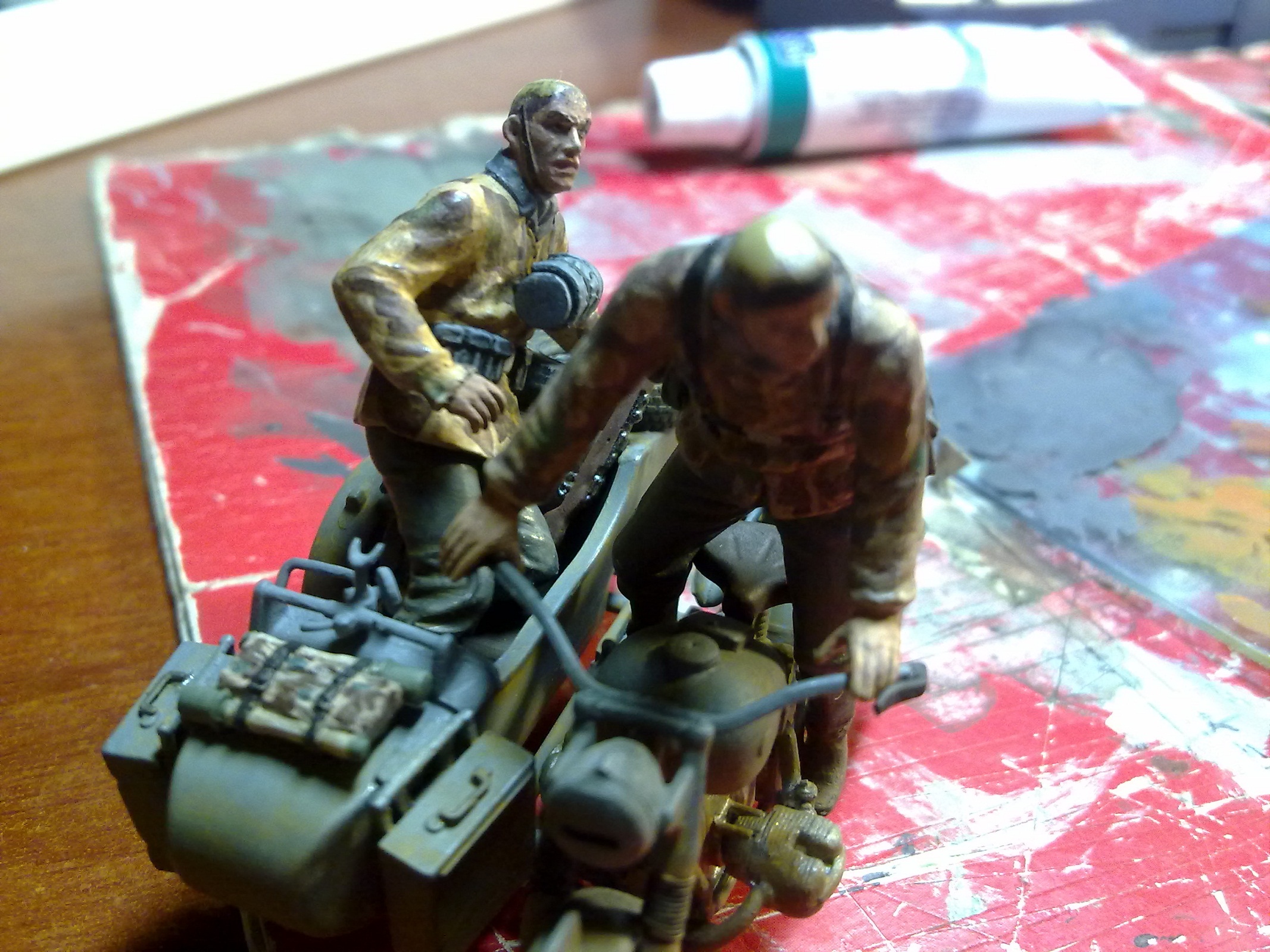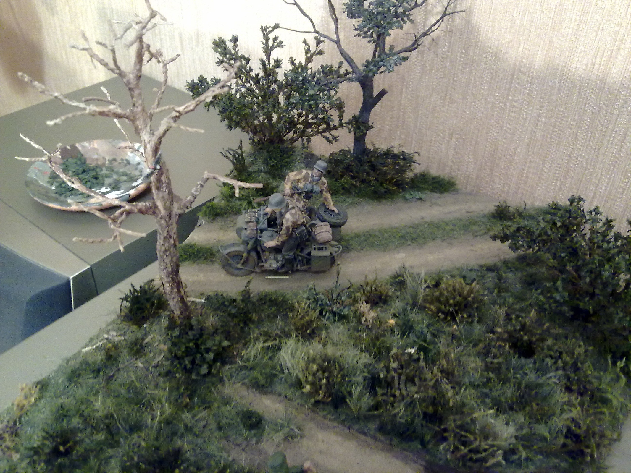 Спасибо!Траву делал из сантех льна,красил тамиевским акрилом трёх оттенков,частично высаживал пучками,в основном посыпал нарезанную паклю,еще кустиками сажал мох,правда спустя 2 месяца весь мох пожелтел,пришлось его красить акрилом,а дерево сделано по книге "Искусство диорамы" листья из листвы берёзы и сирени по 3-4 мм,ствол:проволока и эпоксилин,затем дремель и окраска.