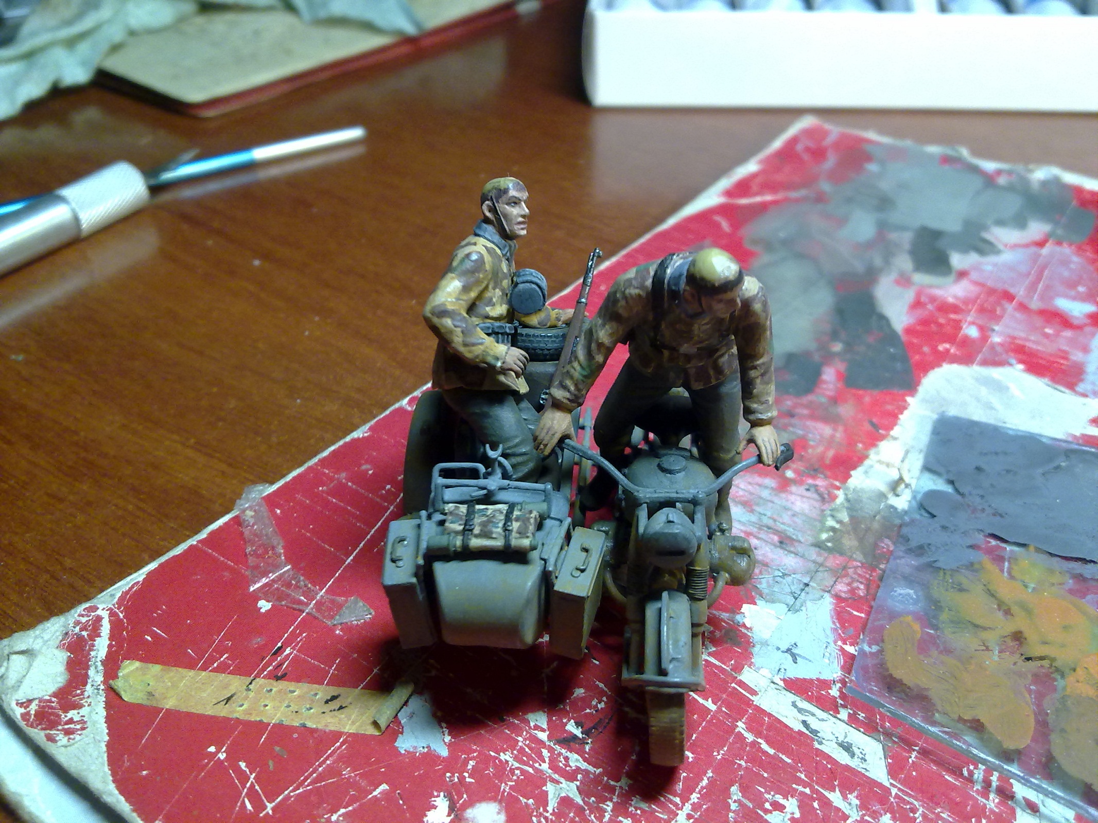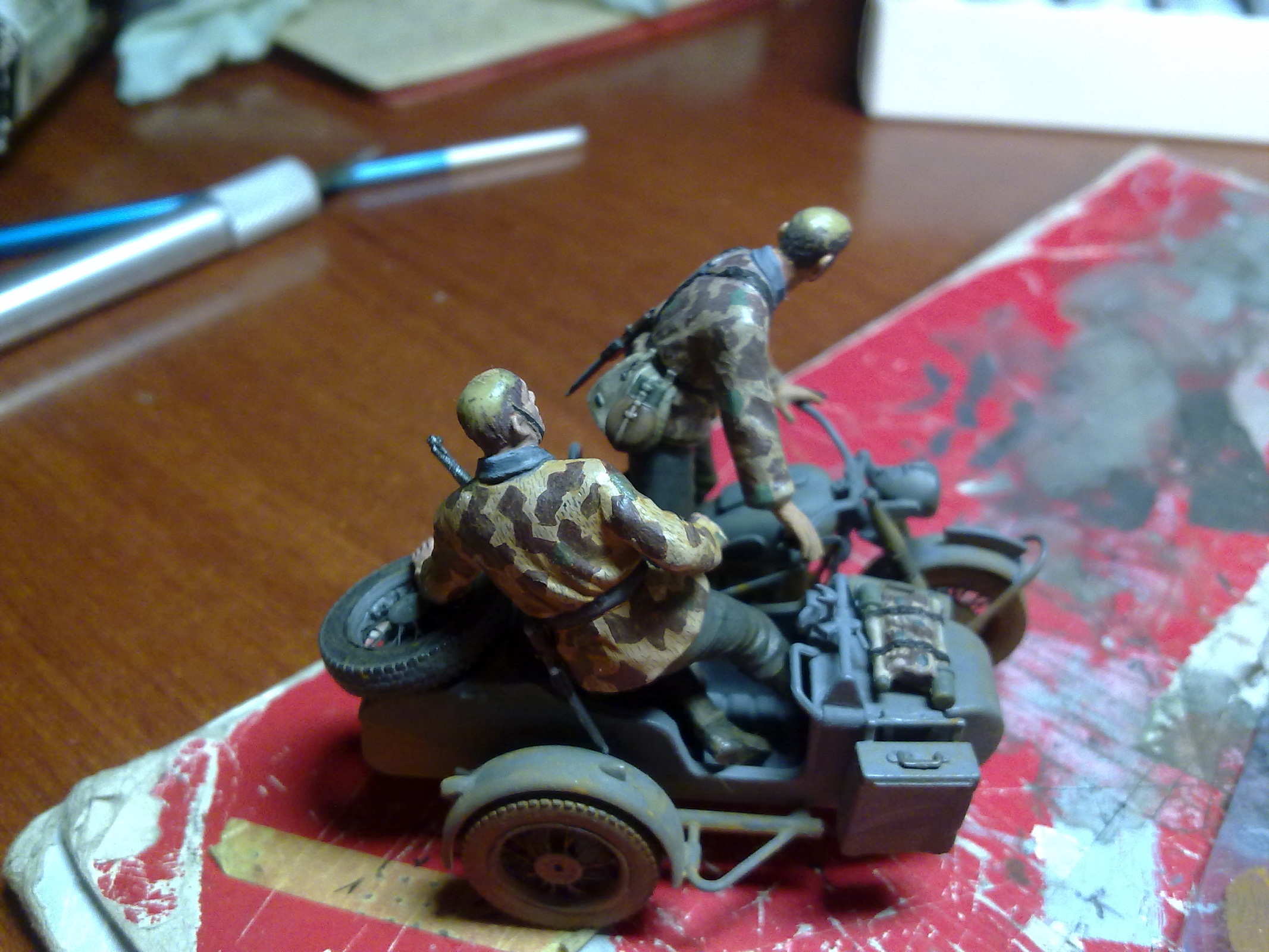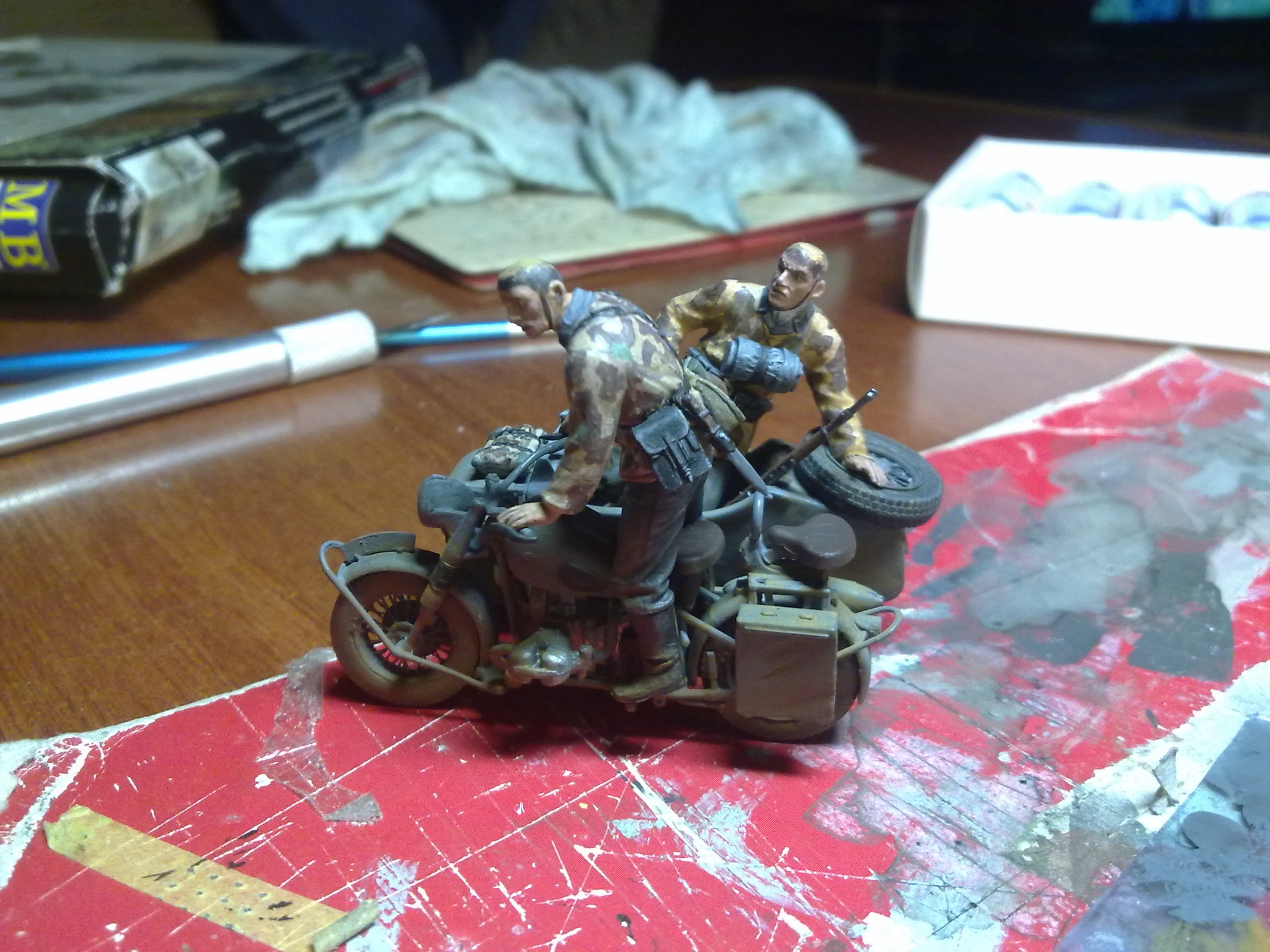 Спасибо!Траву делал из сантех льна,красил тамиевским акрилом трёх оттенков,частично высаживал пучками,в основном посыпал нарезанную паклю,еще кустиками сажал мох,правда спустя 2 месяца весь мох пожелтел,пришлось его красить акрилом,а дерево сделано по книге "Искусство диорамы" листья из листвы берёзы и сирени по 3-4 мм,ствол:проволока и эпоксилин,затем дремель и окраска.