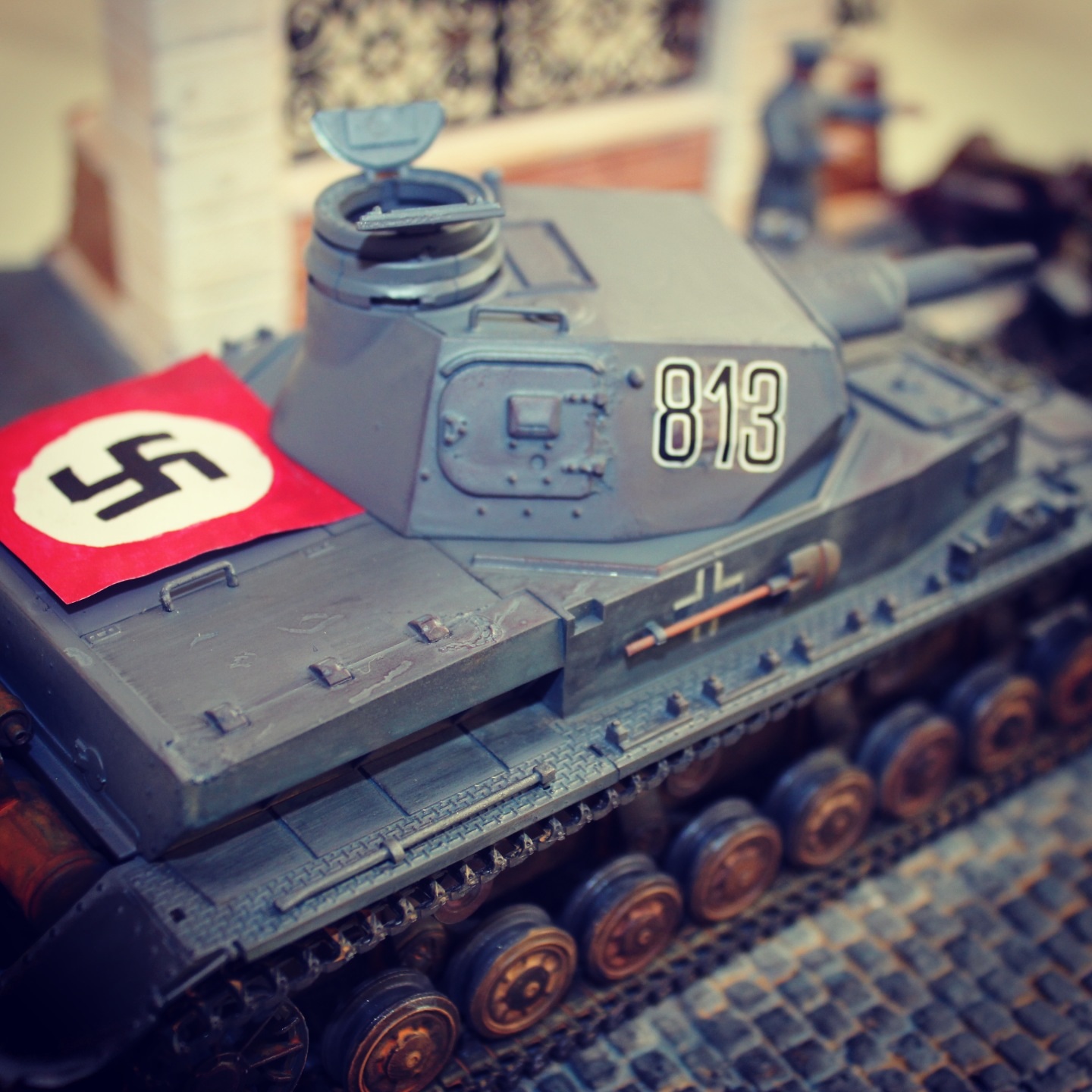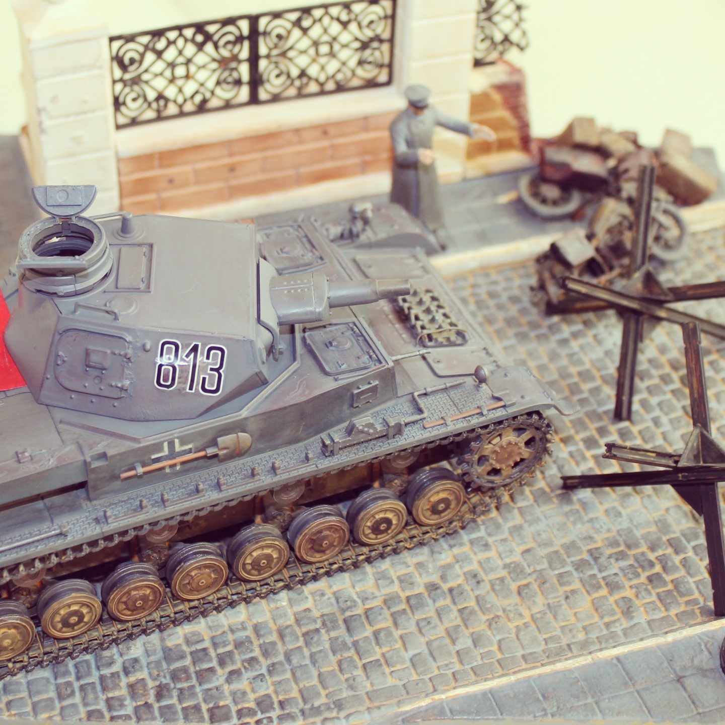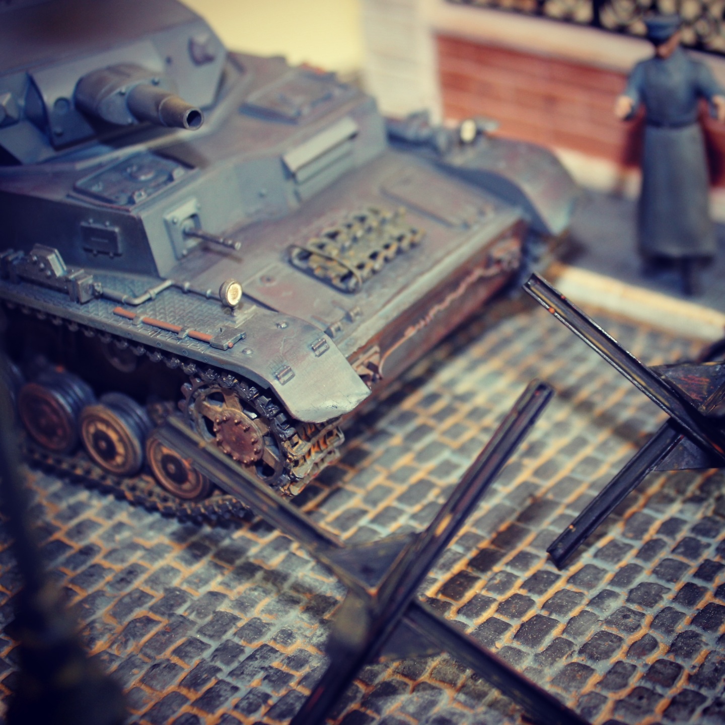 И что может служить обломками в парке кроме кирпичей ничего в голову не лезет. Из бронетехники взял сегодня авто Опель Блиц и Пантеру от Тамии хотел спросить противотанковыми ежами и колючей проволокой адекватно будет дополнить диораму?