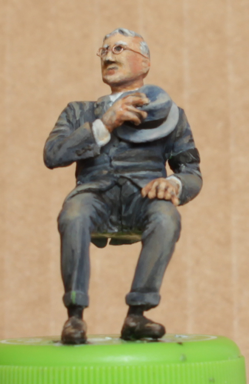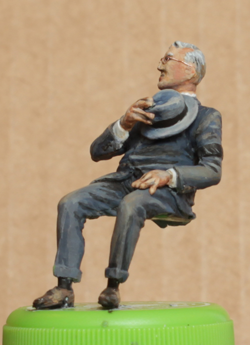 Итак, к форме одежды охраны. Как уже замечал Omskiy Tankist, в связи со спецификой выполняемой задачи специальные агенты могут варьировать форму одежды, которая должна позволить им не выделяться на фоне присутствующих и исключить привлечение к себе внимания. В рассматриваемом случае на агентах из военной формы одежды только куртки. На одних танковые, на других - пехотные (в том числе и на парне с Томми). На всех светлые рубашки, тёмные галстуки, в том числе и с узором, гражданские брюки с отворотами, гражданская обувь. У одного из агентов в руке гражданская шляпа. Так что прав и Omskiy Tankist и Денис Ашхацава. На этом можно поставить точку. Доделал Рузвельта. Очки придётся переделывать. Попробую спаять.