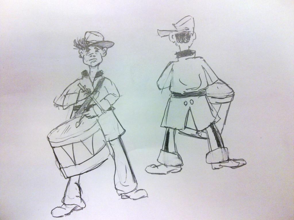 А вот подросток - сам по себе карикатура на взрослого) А если эту карикатурность подчеркнуть, например: излишне длинные, подвернутые штанины и рукава формы (не успели подогнать), длинные полы сюртука, великоватые ботинки, вообще неряшливо, сидящие форма и фуражка, торчащие уши, узость плеч по отношению к тазу, вихры, худоба и воробьиные ноги - руки, непрпорционально большой барабан?)