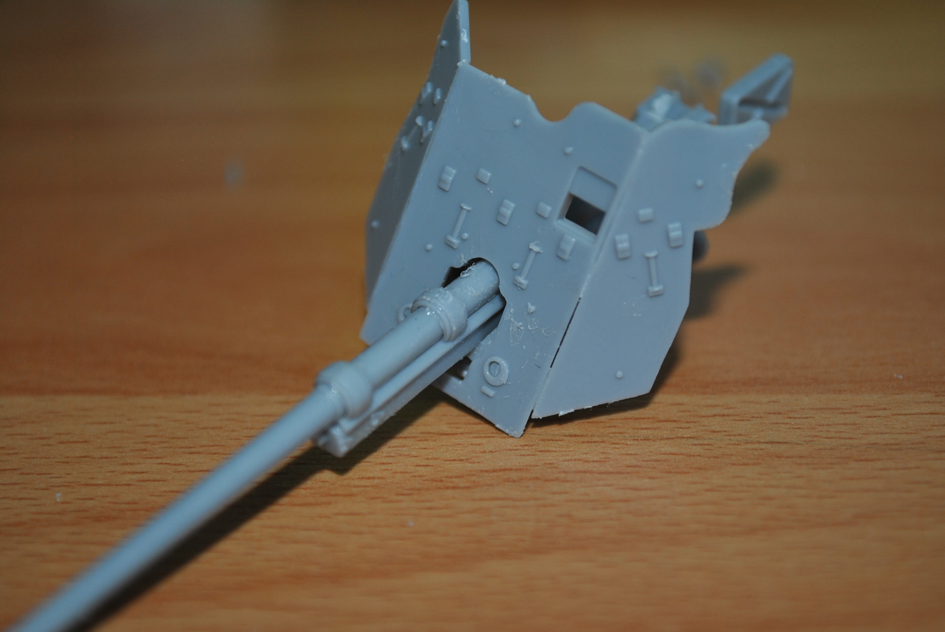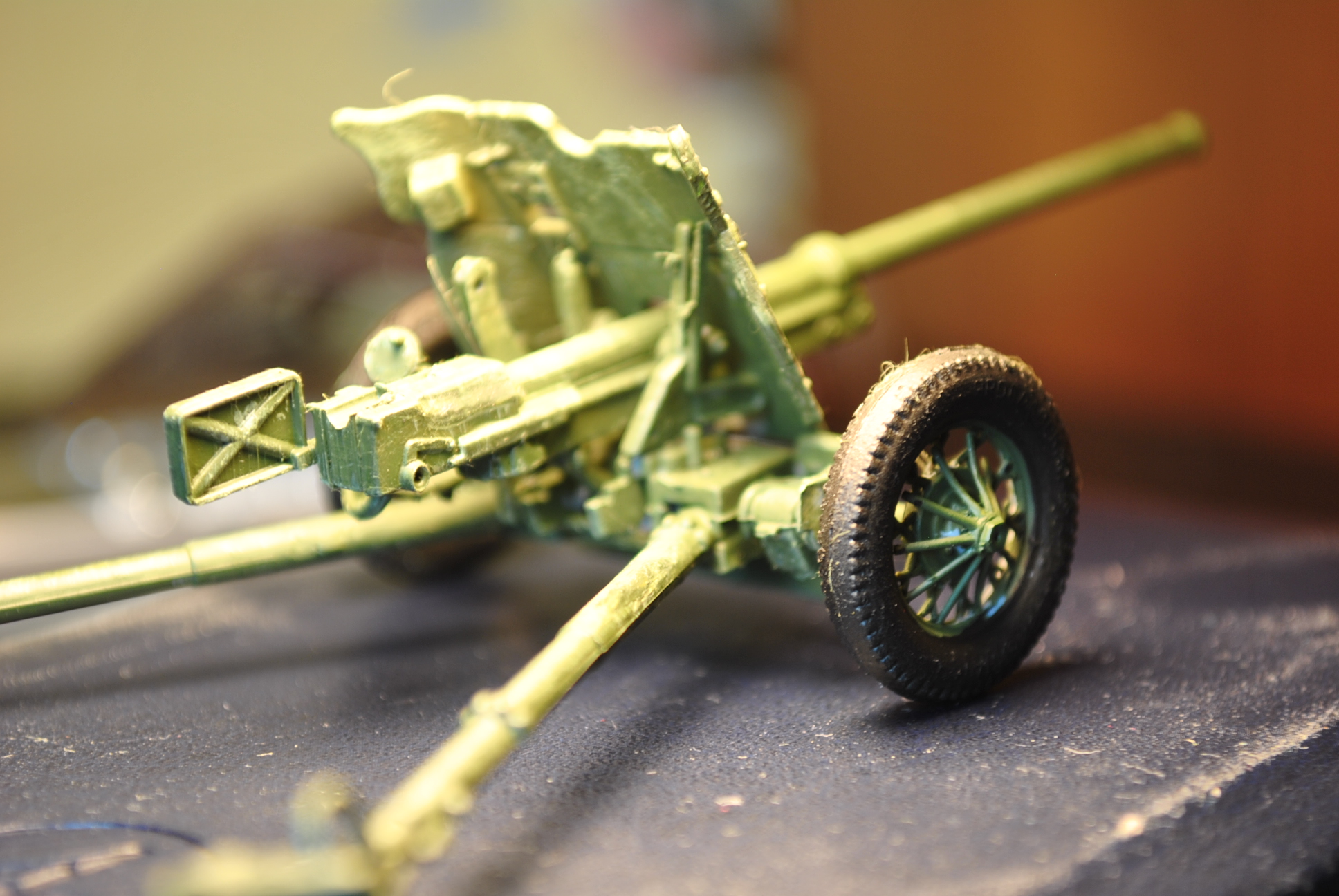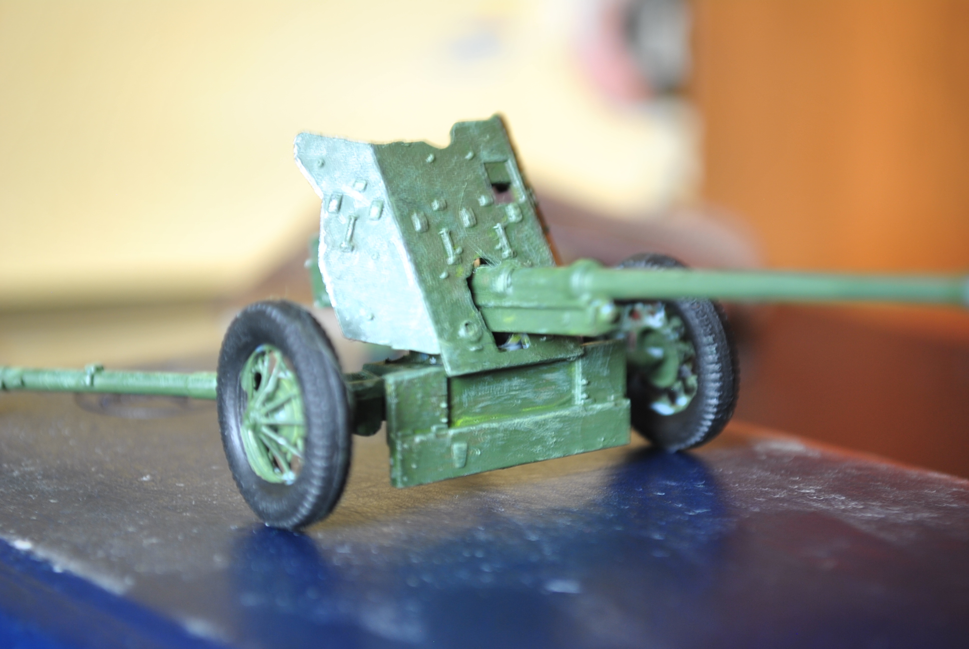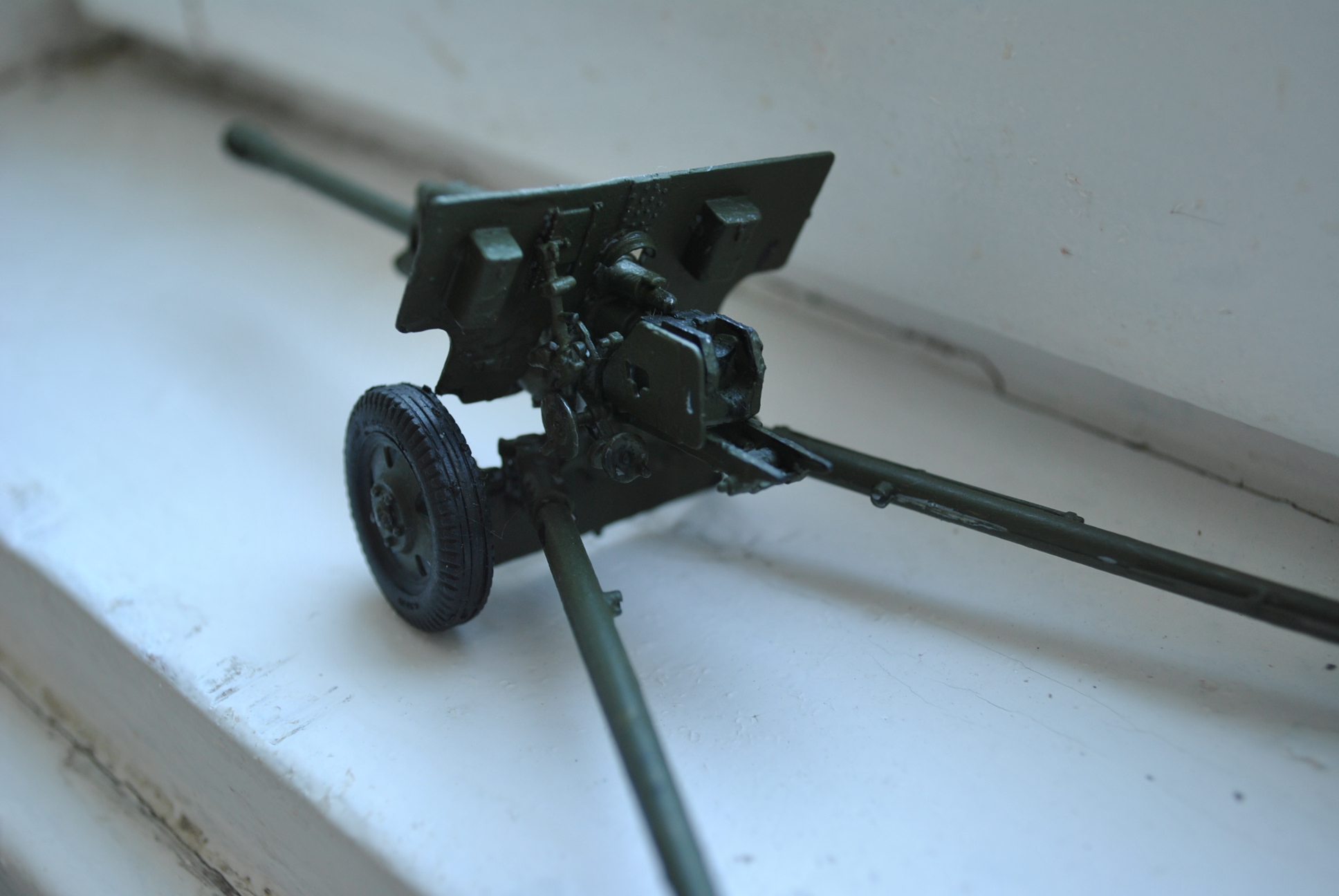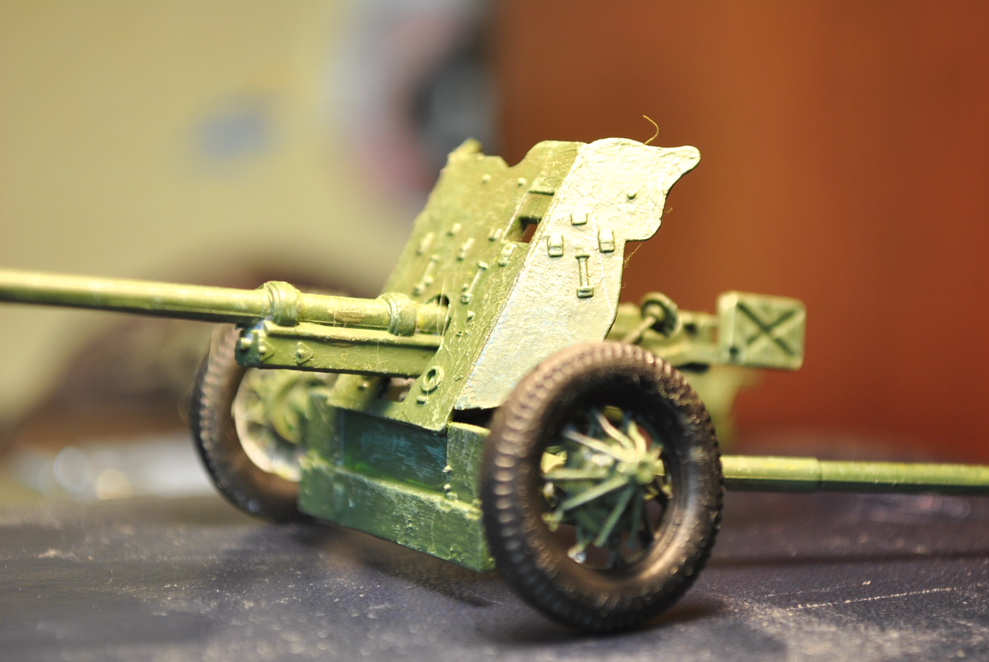 White Fox, когда краска лежит комками, исправить тонировкой это невозможно. И далее помодели: щит и шиток в районе казенника далеко не масштабы по толщине,лучше травлением заменить и ли сделать эти детали самому. Как и спицованные колёса.
