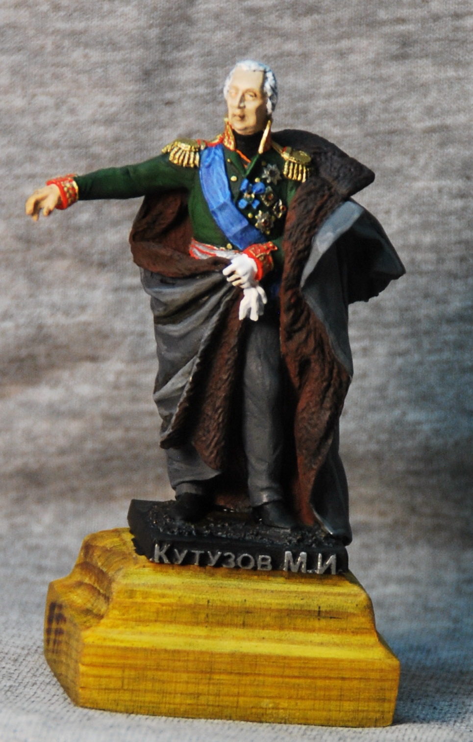 Кутузов показан в темно-зеленом мундире общегенеральского образца 1808 г. с золотым шитьем, эполетами и пуговицами. Поверх мундира через правое плечо – голубая лента ордена Святого Андрея Первозванного. Черно оранжевая лента ленты ордена св.Георгия надета под мундир. В розетке из андреевской ленты изображен жалованный портрет императора с бриллиантами.