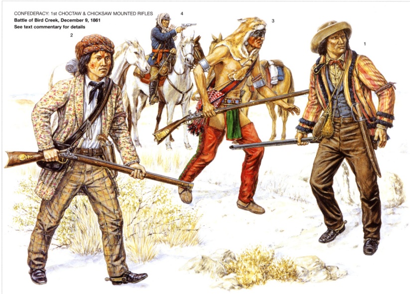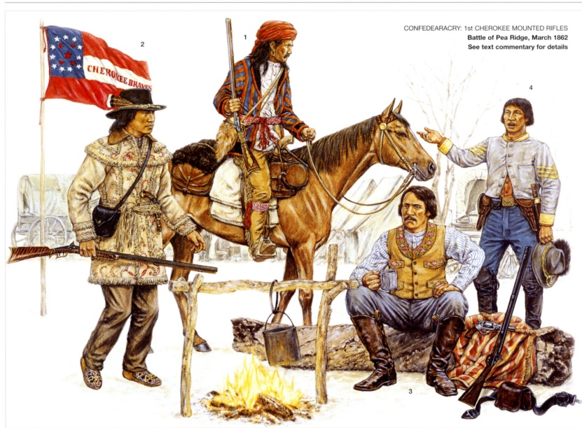 За Север сражалось девять-десять тысяч индейцев, за юг около двенадцати тысяч. Индейцы, вопреки легендам, небыли уж какими-то особо крутыми воинами. Были как все: не лучше и не хуже. Врождённая неприязнь к дисциплине, горячая кровь и чрезмерное изобилие всяческих Понтов и Гонора эпохи томагавка и копья решительно негодились для начинающей зарождаться эры многозарядных ружей и тотальной войны без Понятий и Чести. Да, по-отдельности они были прекрасными кавалеристами, ловкими разведчиками, отменными стрелками; кавалерийские рейды и диверсии в тылу противника доставляли тому немало неприятностей, но при этом индейцы старались далеко не уходить от своей Индейской Территории. А в открытом бою с неподдавшимися панике при крике «Индейцы!»: против опытной пехоты, поддержанной артиллерией, против дисциплинированных кавалеристов, держащих строй и не увлекающихся тупой рубкой – краснокожие воины никаких таких особых преимуществ не имели и быстро теряли боевой пыл. Да и внешне выглядели совсем не так как в фильмах киностудии «ДЕФА»: вполне – если бы не черты лица и мелкие фенечки типа пера в длинных патлах, яркой жилетки, мокасин, банданы или шляпы-цилиндра – тянули на WASP-американца той или иной степени зажиточности, особенно учитывая изобилие метисов индейско-европейского и индейско-африканского происхождения ( у них и свои плантаторы-рабовладельцы имелись).