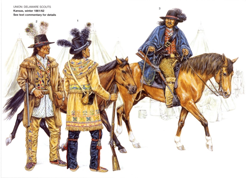 И без того не особо дружные племена индейцев война расколола на два лагеря. Кто-то ввязался в эту заваруху польстившись на обещания, кому-то принадлежность к одной из сторон сулила экономические и политические выгоды; большинство же принимало чью-то сторону только из-за того, что их традиционные враги оказывались в противоположном лагере. Вобщем, почему угнетаемые индейцы сражались за тех или иных – но своих бледнолицых гонителей – тема отдельная и не здесь о ней говорить. (Любознательные могут глянуть Википедию, статьи: «Пять цивилизованных племён», «Индейская территория в Гражданской войне» и «Воинские формирования Индейской территории в армии Конфедерации» - малАбукАв но для кругозорУ пользительнА.) Наиболее обиженные племена вступили на путь борьбы вообще со всеми – тупо стали под шумок грабить и резать всех, невзирая на цвет кожи и политические пристрастия.