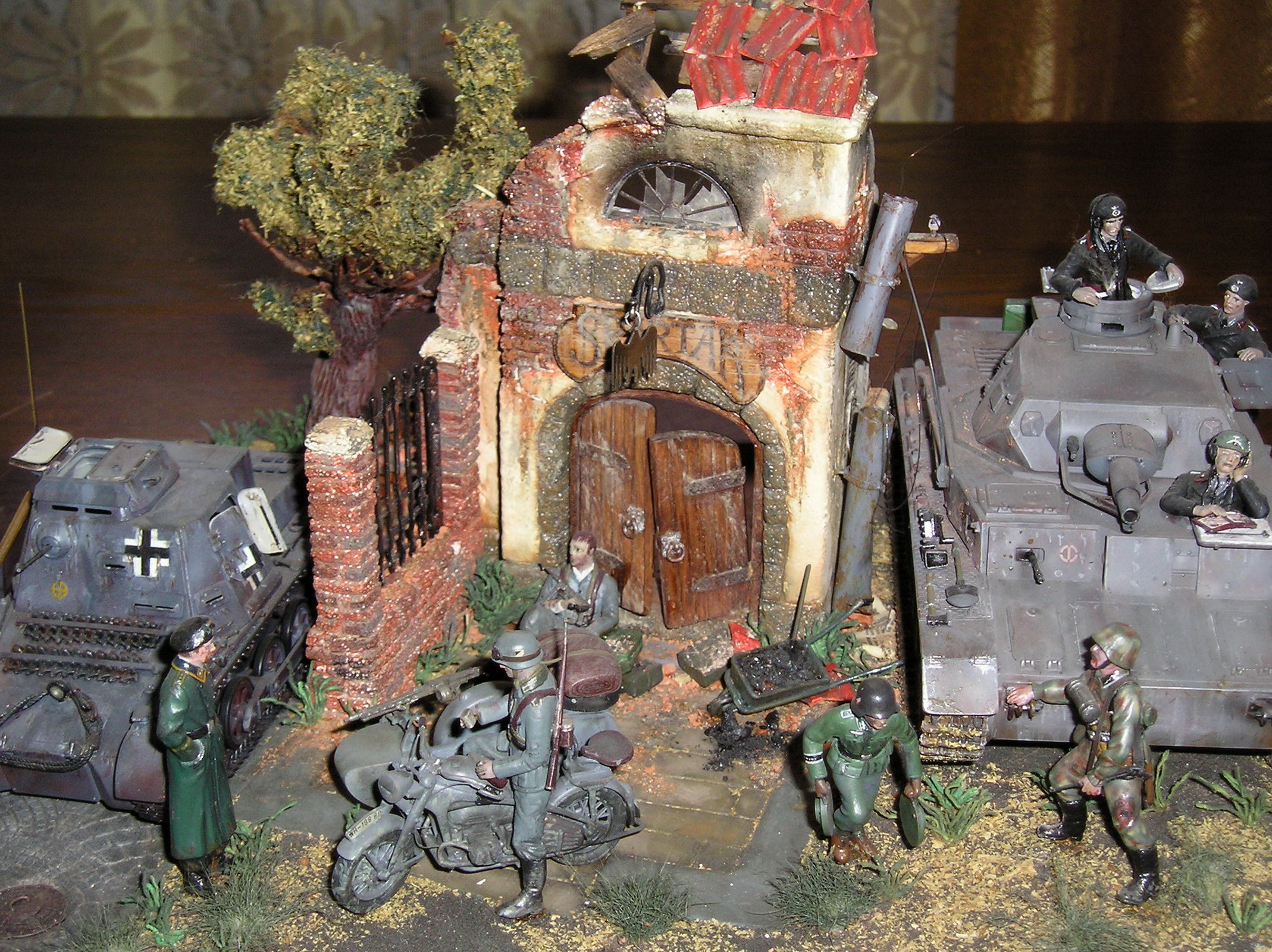 Благодарю за отзывы.Данная диорама действительно первая и достаточно давняя - 2002 г., чем, надеюсь и объясняются справедливо указанные недостатки. Что касается блеска, то в те далекие годы красок нормальных не было, мешал сам различную нитру. Теперь почему Австрия - видел на одной фотографии похожий деревенский кабачок, маленький и симпатичный, захотелось воспроизвести.