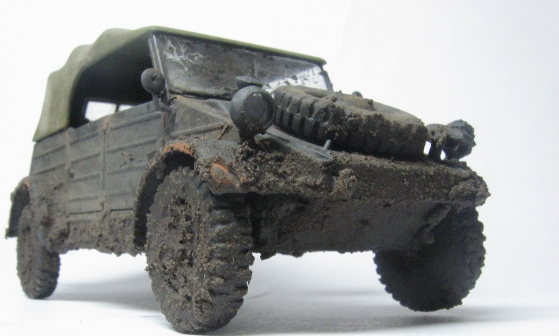 Грязный чухон... Что рекомендую сделать: радикально пару раз обработать пигментами разных оттенков. Желательно, с применением фиксатива. Такие чухоны, как правило, ещё и весьма пыльные. Далее, раз уж мы замазали его всего пигментом, нужно имитировать сырую грязь. Это просто- кисточка и глянцевый лак. В подсыхающих местах можно получить эффект с полуматовым.