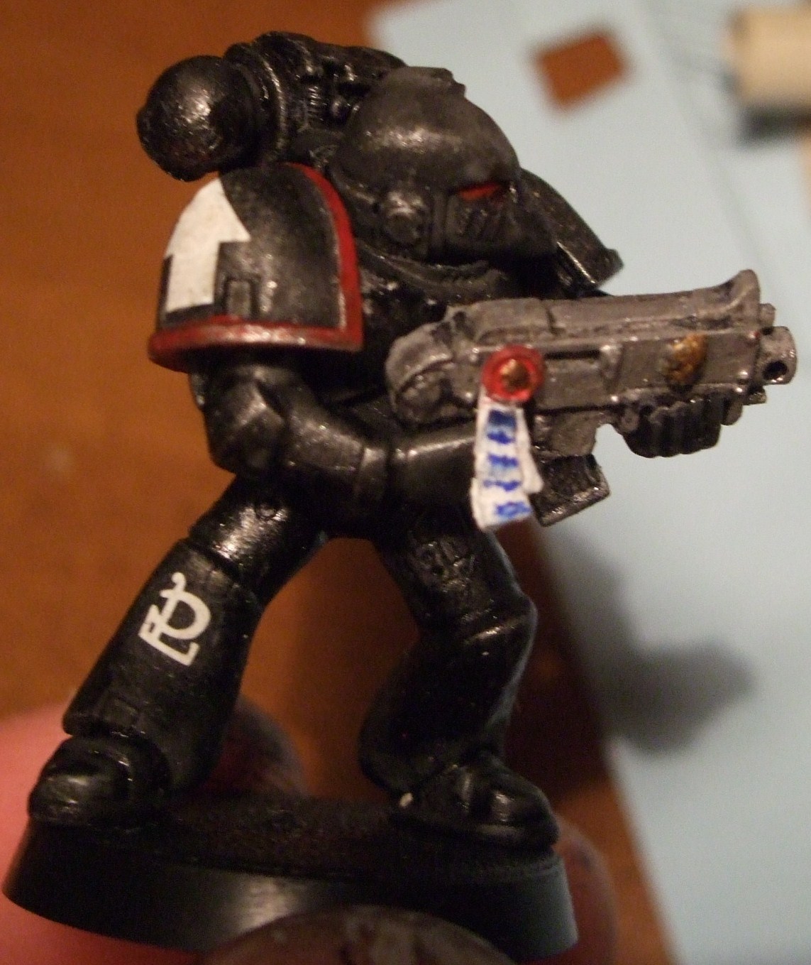 Собственно космодесант из набора games workshop space marine combat squad.красился нитрой и акрилом, рассверлен ствол, перевешена печать чистоты с ноги на болтер
