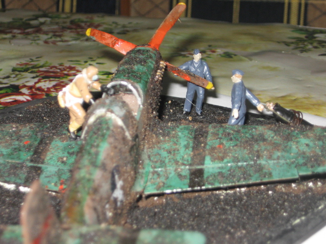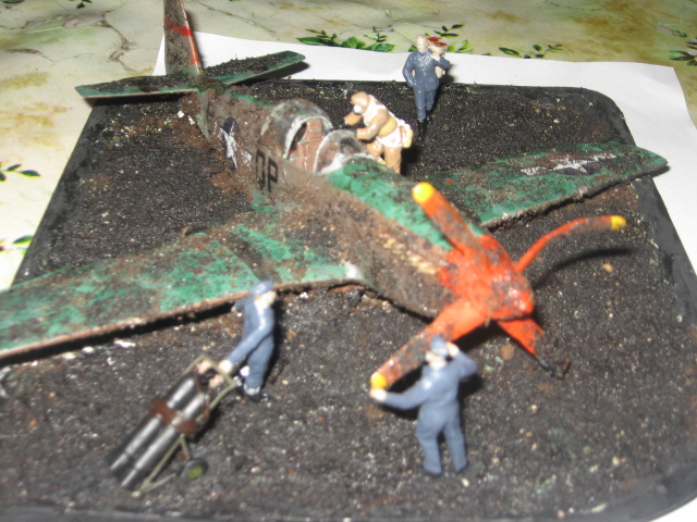 Нлогично как-то всё. Фигурки старательно изображают подготовку к взлёту: пилот лезет в кабину, техник тащит баллоны со сжатым воздухом (использовались для быстрого запуска двигателя - вместо стартёра), другой техник готов крутнуть винт. А вот самолёт уже отлетался, как минимум - на сегодня. "А мы сегодня ещё летать будем?" - "Нет, на сегодня дров достаточно" (из к/ф " В бой идут одни старики").
