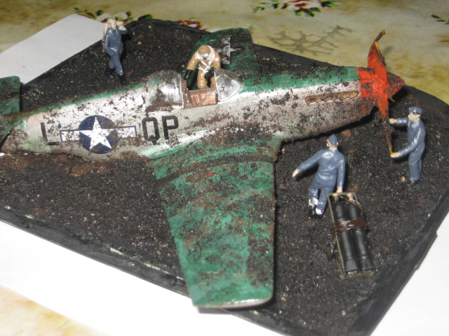 Предлагаю на Ваш суд мою очередную диараму, в которой использовал модели фирмы "ICM"- "Мустанг Р-51С" и "Пилоты и техники истребительного командования ВВС Великобритании (1939-1945)" масштаб 1:48. Самолёт загрунтовал автомобильной грунтовкой, покрасил красками фирмы "Звезда", пришлось поломать шасси и винт в связи с задумкой диарамы. У техника, который тащит за собой баллоны с воздухом, добавил шланги. Основа-гипс, покрытый земля+клей ПВА+лак по дереву (для придания эффекта мокрой земли).