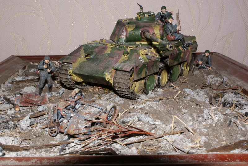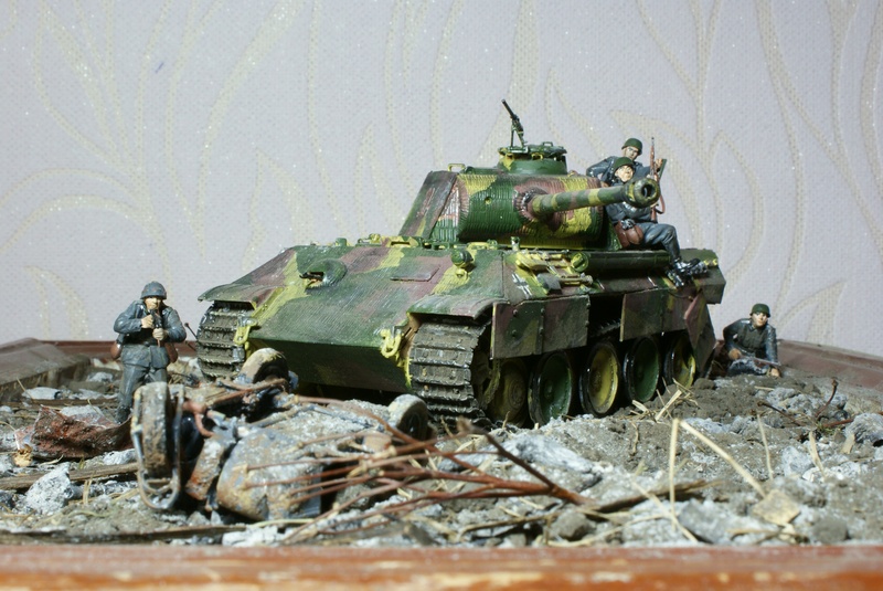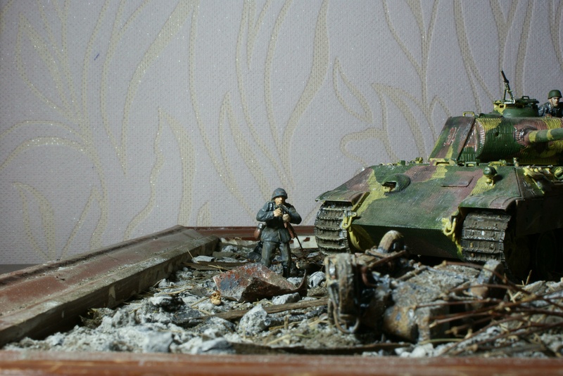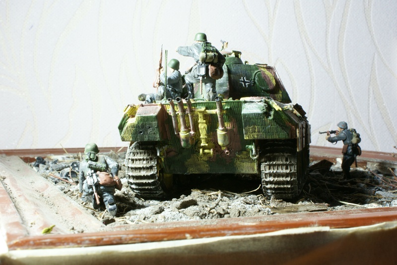 пантерка чистовата для такой "грязной" диорамы,фигурки блестят,незаделаны стыки рук с туловищем + гусеницы мог бы хотяб к колесам приклеить(сверху)