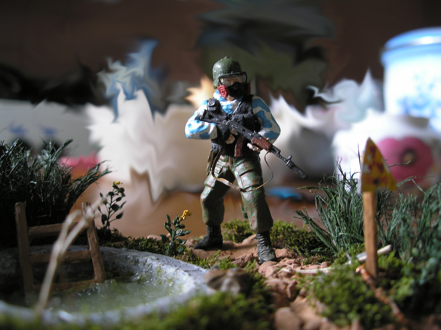 Оч.понравились вода и потоптанный песок, трава тоже живенькая. Фигурка, честно говоря, не совсем: порты блестят, рубашонка какая-то дикая, ДЕмаскирующая... Правда, я и сам вечно борюсь с соблазном изваять нечто дикое, типа в кислотный горошек. Но всё это дело наживное.