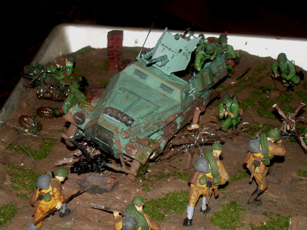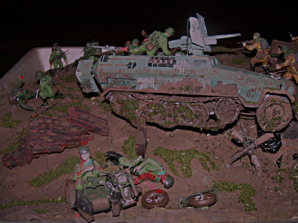 Замысел диорамы - показать ожесточенный бой. Примем за основу. Что имеем по композиции? Имеем смещение наполнения в сторону ханомага и стороны, где он находится. Угол, где есть перекрытие, остается пустым. То есть, на будущее, если делаете дио, то заполняйте всю ее площадь зрелищем. Это не обязательно насовать в угол с перекрытием еще солдат. Как вариант, туда можно поставить 45-ку нашу. Она будет уравновешивать.Надеюсь, идея понятна.
