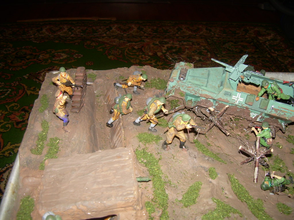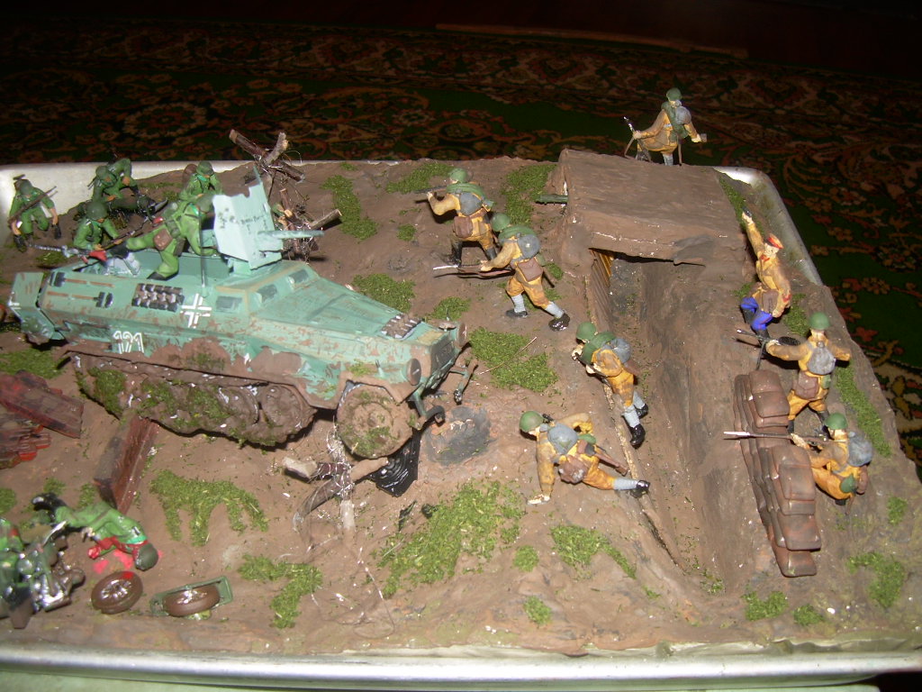 Исполнение замысла. Мало натыкать фигурок. Для разглядывания надо больше фишек в таком объемном деле. Противотанковые ежы - хорошо, но мало. Как вариант - несколько разный по величине рельеф местности. Типа, здесь может ханомаг проехать, а тут только пехота пройдет. Потом, исполнение самой местности. лучше брать за основу то, что видели сами. Провереный способ. Не доверяете себе - фоткайте. На фотик, на телефон. Потом сверяйтесь. Потом - реалестичность. В Вашем случае - кладка из мешков - фантастика. С большой буквы "Ф". А любая такая деталь может испортить впечатление. То есть вывод - заранее продумайте, что и как у вас будет на дио. Потом подумайте - а могло ли это быть. Неуверены - спросите/поищите в инете, щас возможностей многоооо.