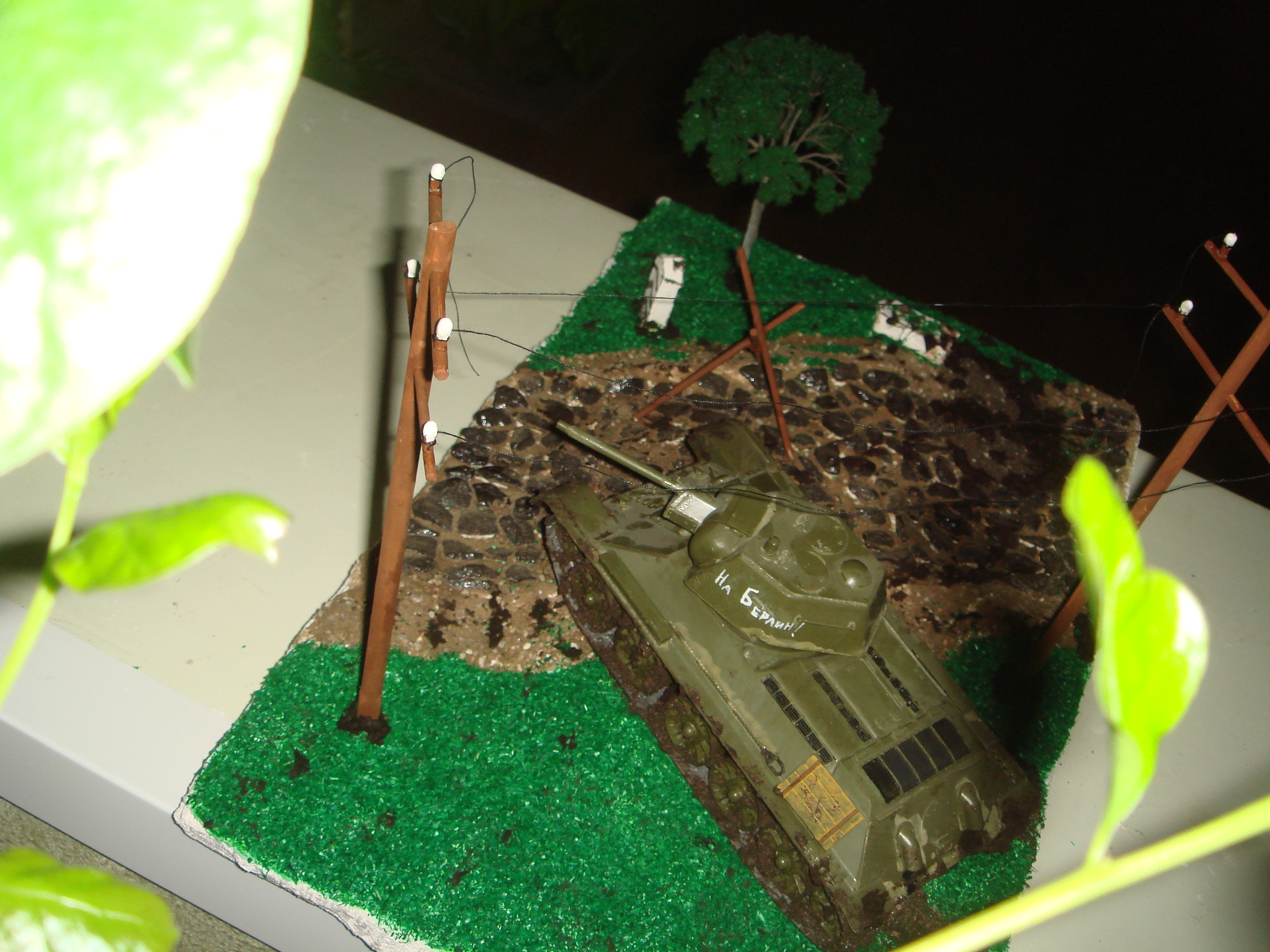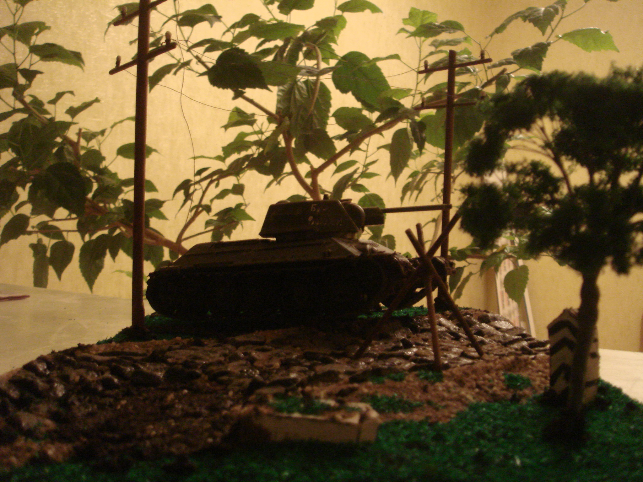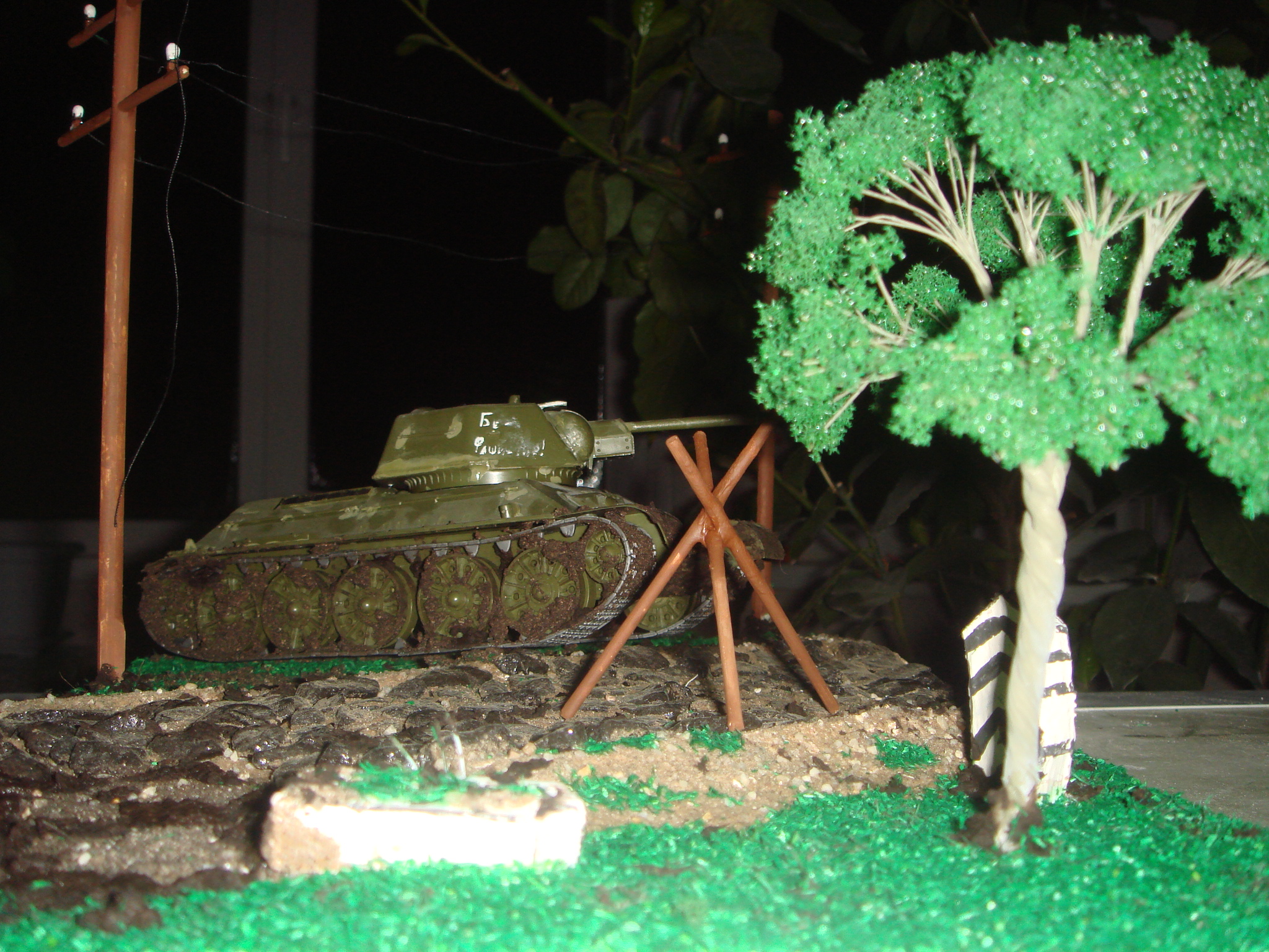 Танк - т34/76 "Звезда".Дерево не помню какой фирмы или производителя , могу лишь сказать , что купил его в магазине на мСавеловская. Тамже была куплена насыпная трава. Больше ни каких спецефических аксессуаров не использовалось.