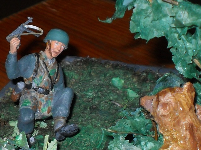 Хотел бы представить результат своего первого диорамостроения.Немецкий десатник пробираясь по лесу натыкается на Хозяина и, есстественно, пугается.Немец из набора ЗВЕЗДЫ подвергся переработке: правая нога и руки от другого десантника из этого же набора.Деревья сделаны из веточек какого-то кустарника, трава- сантехнический лён. Листья из окрашеной бумаги. Медведь самолепный из массы ДЖОВИ. Основание- папье маше.