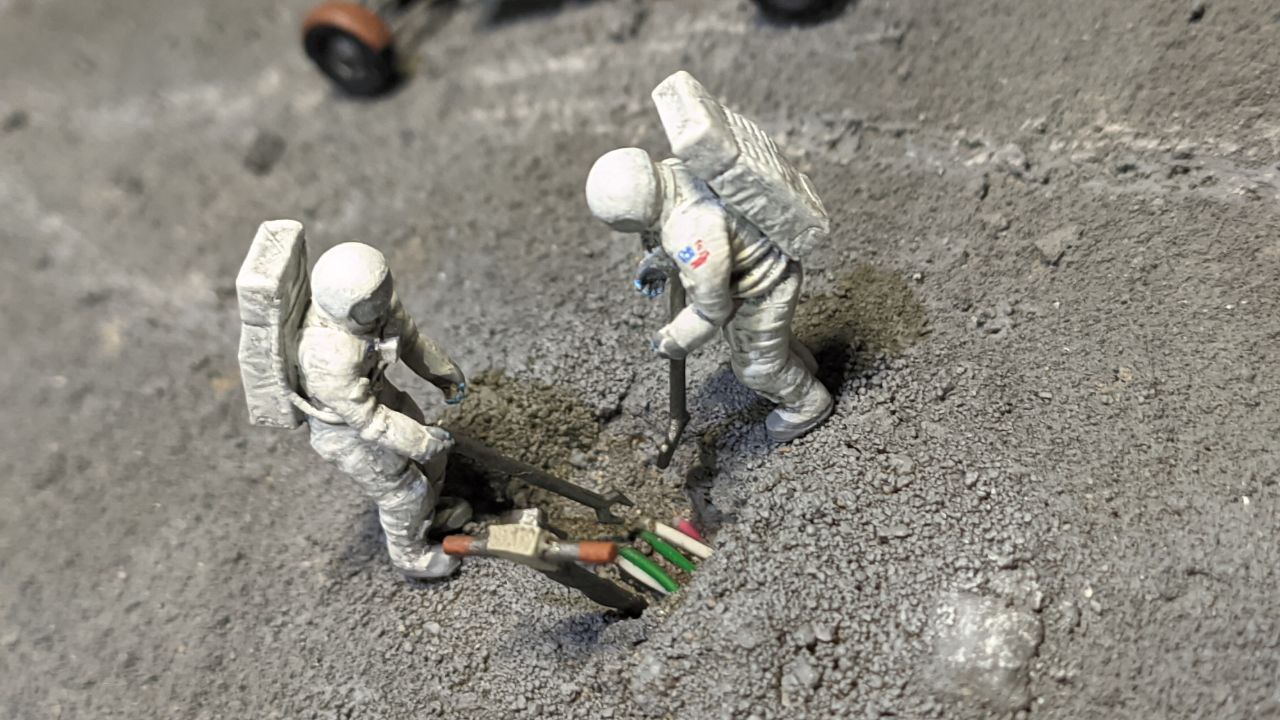 Фантастически - юмористическая диорама. «Хьюстон! У нас проблемы!!!» Размер 675х510х140 мм. Масштаб 1:72. Все модели и фигурки 3д печать. Взяты из открытых источников. Краски акрил. Основа - вспененный полистирол. Терра - поролон, шпаклевка, песок, мелкий гравий, цементная пыль и ПВА. Мой ответ на многолетний вопрос - были ли американцы не луне?. - Да были! Но что-то пошло не так ..........
