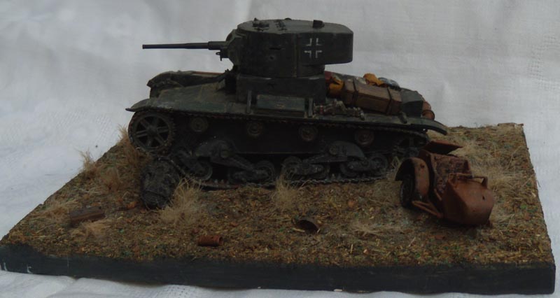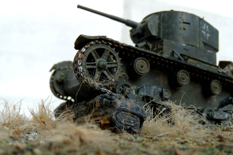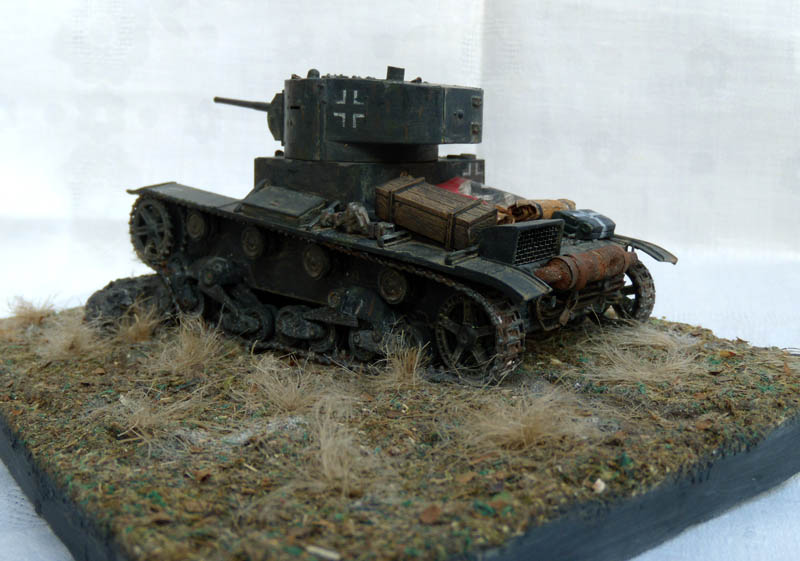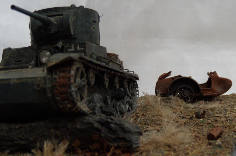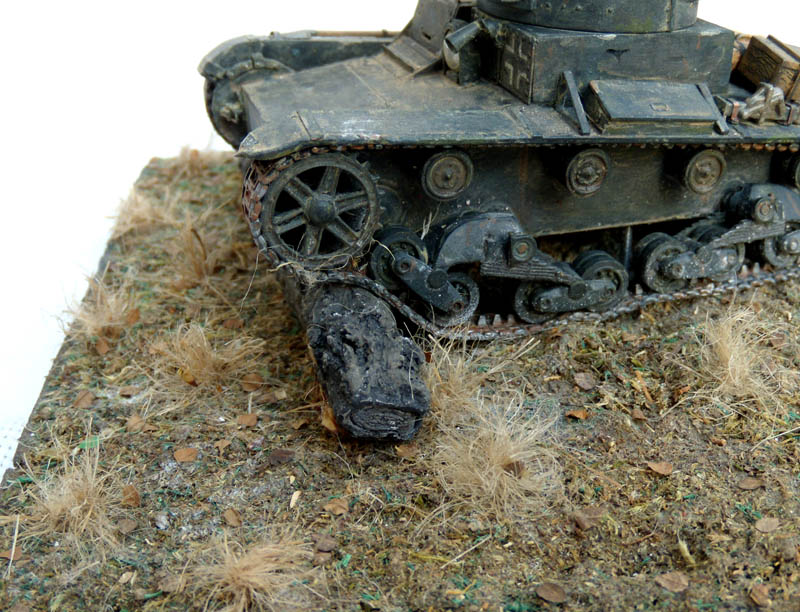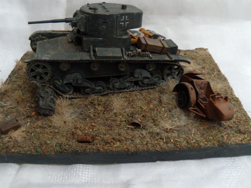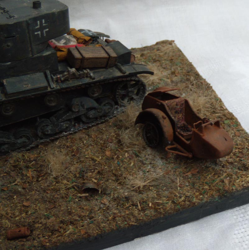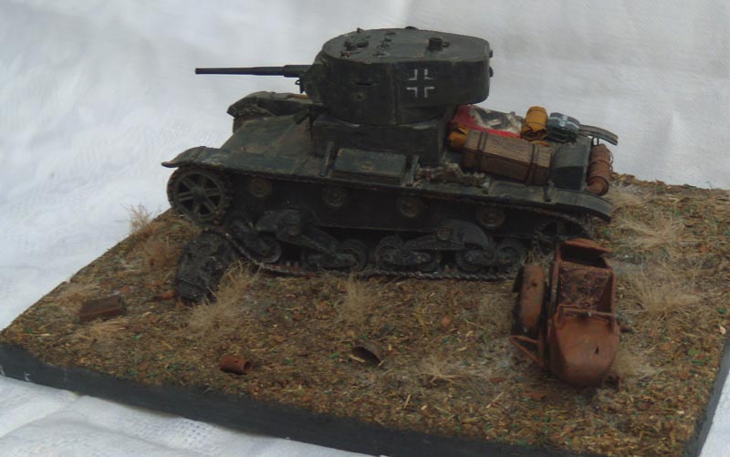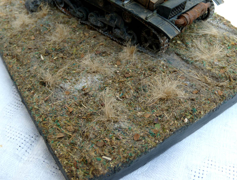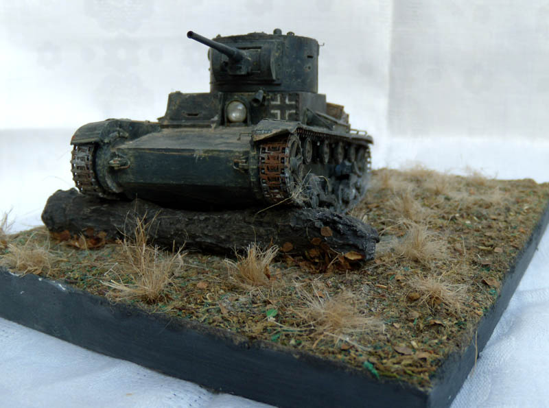 Если это диорама, то композиция неудачна. Танк смещен от центра в угол и образуется ничем не занятое пустое место. Из-за этого пропадает весь смысл, если он конечно был. Если это подставка под танк, то она слишком большая, и совершенно не гармонирует и не акцентирует внимание на танке. Танк просто теряется на такой подставке.