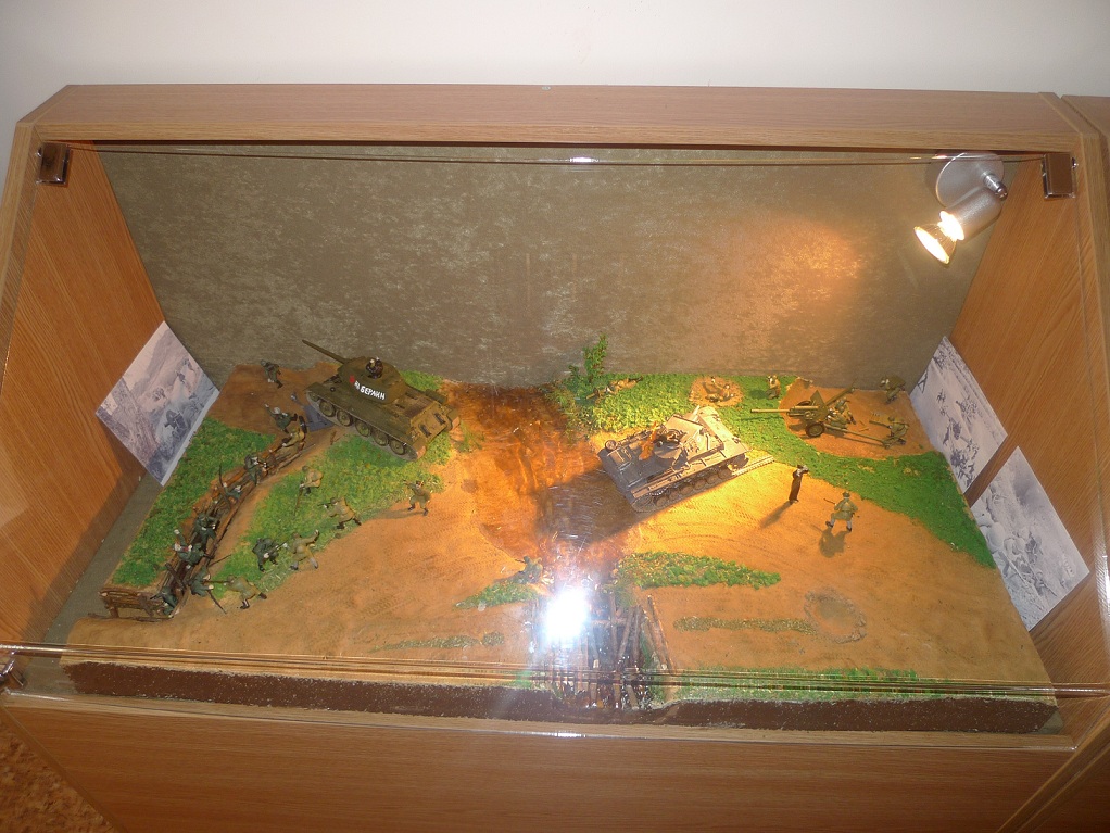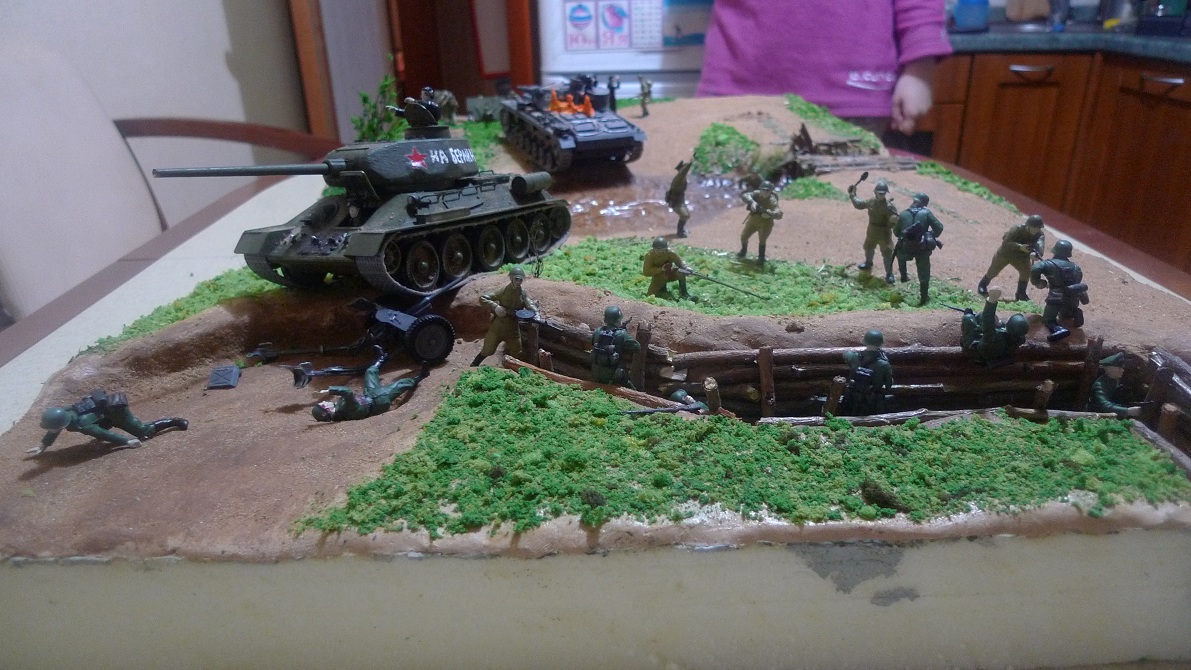 Фигурки - разные: ЗИС-3 с расчетом Миниарт, немецкий танк - Тамия, русские солдаты и Т-34 - Звезда, немцы - звезда и какие-то "вражеские", не помню.