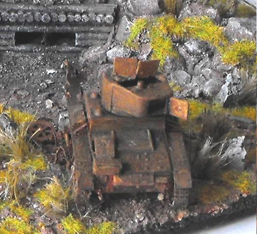 С самого начала решил, что нормальный вид горелому танку и бронеколпаку придаст только рыхлая, объемная ржавчина.Визуально помню, что прогоревшие в огне массивные железяки ржавеют отслаивающимися хлопьями, причем цвет меняется от темно-ржавого до ярко-желтого. Это и пытался воспроизвести. Делал я это так. Выбранные места поверх основного цвета (Ржавчина, "Звезда", акрил) покрывал точками и маленькими участками зубочисткой матовым лаком, поверх него присыпал мукой, излишек сдувал. После высыхания "наросты" прокрашивал основным цветом. Потом покрывал смывкой, а после высыхания - слегка тонировал сначала ржавчиной, потом, поверх - желтым.