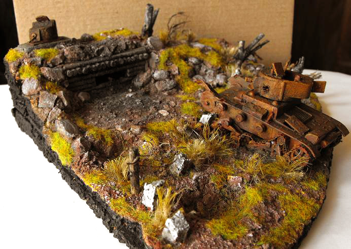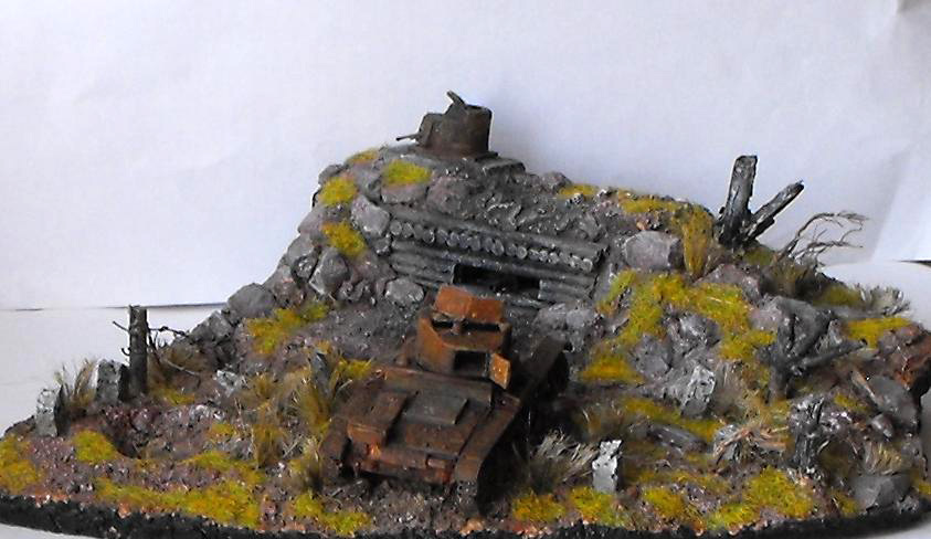 Подставка - листы прессованой пробки. Надолбы - тоже пробка. Дот самопальный, из литников, бронеколпак на доте - башенка от 2-х башенного Т-26 той же фирмы.