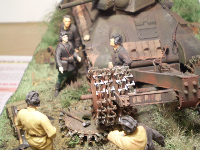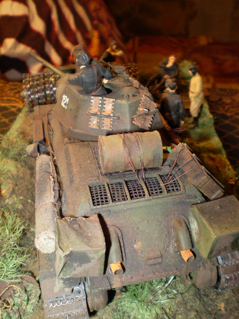 Алексей Хахулин, во-первых, хотелось бы снимков почётче, не разобрать ничего. Во-вторых, фотографировать лучше при искуственном освещении с 2-х точек. Это по качеству предоставляемого наглядного материала. По композиции и рабте, что рассмотреть удалось. Первое - сетку над жалюзи вы совершенно неправильно иммитировали, ячейки под углом 45 градусов идут и они более мелкие. Второе - бочку так на Т-34 невозможно привязать - от жалюзи трос или верёвка оторвётся, точнее, планка скорее всего не выдержит, а на люке доступа к двигателю прицепиться не за что. Что делают гильзы на надмоторной плите - непонятно, "Дегтярь" на башне - тоже. По фигуркам - Показывающий командир и солдат в гимнастёрке "руки в боки", ладно, пришлые, не из экипажа. А остальные, судя по композиции, имеют прямое отношение к данной машине. А в ней не 5 человек экипажа, а только 4, так что один лишний. А когда на башне сидячей фигурки нет, то непонятно, куда оставшийся боец смотрит, как бы вываливается из общей сцены. В отбчем - работайте, товарищ!!!
