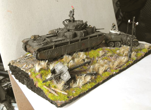 Основание - листовая пробка. Булыжники - обычные камешки. Трава для ж/д моделирования, высокая, сухая трава - сантехнический лен. Краски - акрил, "Звезда".