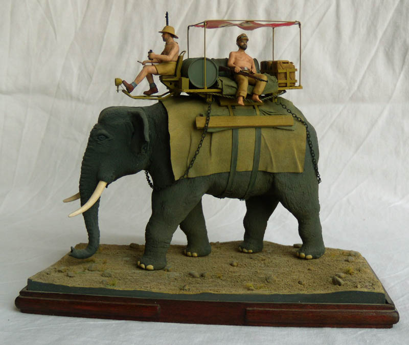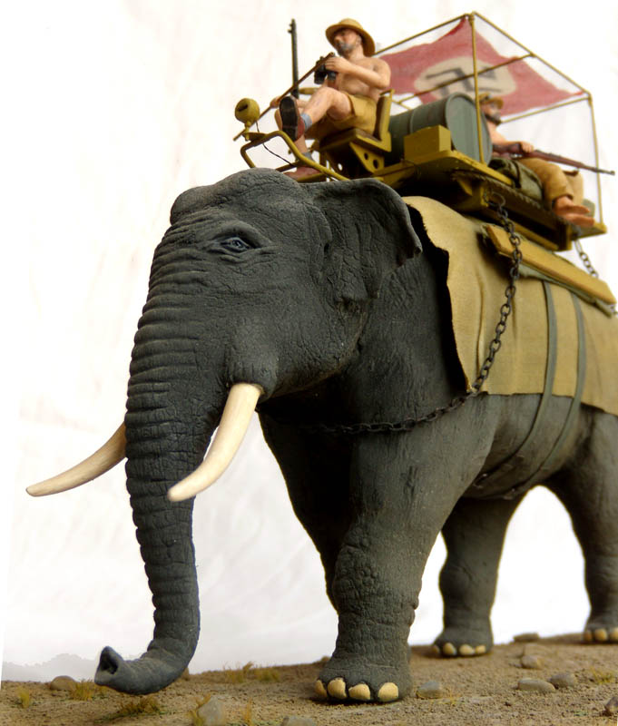 О самой модели - масштаб 1/35. Слон вылеплен из пластики. Внутри корпуса был вставлен деревянный цилиндр - для экономии материала. При запекании - благодаря этому цилиндру слон благополучно треснул.В результате чего его пришлось склеивать циакрином. После запекания и грунтовки я увидел что структура кожи мало походит на слоновью. В результате слон был немного перешкурен, частично перешпаклеван нитрошпаклевкой и заново перегравирован весь рельеф кожи. Вид и сейчас - не айс, но хоть из далека смотрится более менее :) Бивни - полистироловые литники - согнуты над свечкой и обточены. Окрашен слон эмалями Ревел, и немного тонирован акрилом.