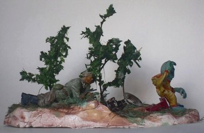 Использован второй номер пулеметного расчета "Звезды", чуть изменено положение руки поддерживавшей ленту: теперь она отводит ветку от лица.Заменено оружие. Пришелец из эпоксилина "Момент". Основание: масса для лепки Jovi и сантехнический лен. Листва- мелко нарубленные искусственные листья от какого-то декоративного украшения. Окрашено акрилом. Обломки НЛО взяты у электриков в подсобке, что это- не знаю.