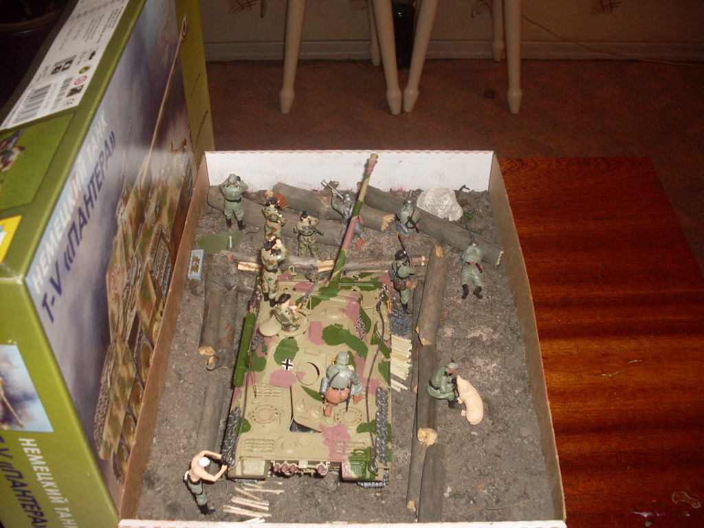 Сей "шедевр" был создан года 2 назад, как с-а-а-а-амая первая попытка-эксперимент вокруг танка изобразить что то. Просуществовала "композиция" недолго - домашняя собака разорила позицию и повытаскивала палочки. Недавно просмотрел фоты и поулыбался. Не удержался и решил выставить!