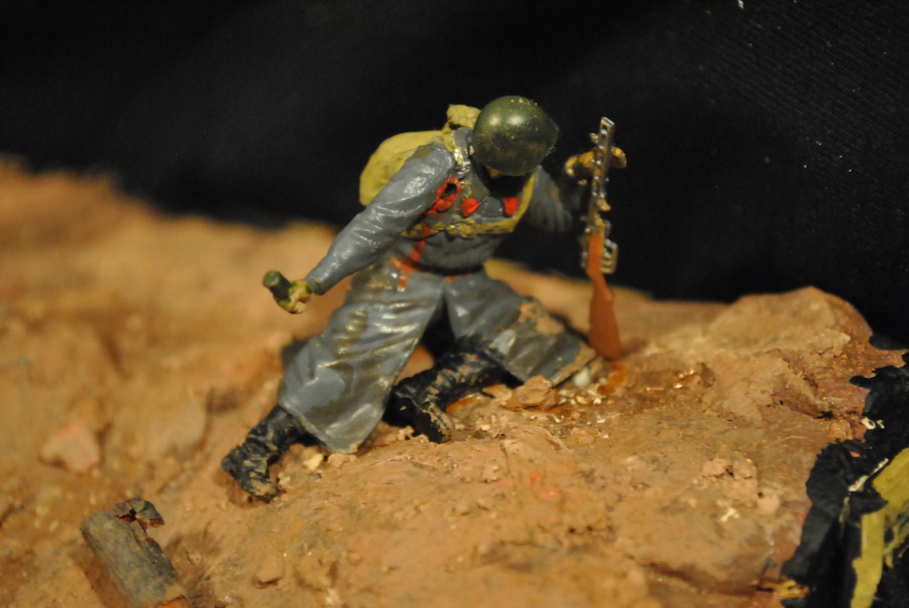 Ну что тут сказать. Работайте, батенька. Фигурки блестят, тонировки не видно вообще, композиция плохая. Непонятно, как боец, у которого рана на пол-руки ( такой калибр вообще должен был руку оторвать, как минимум - кость надвое разорвать, а этот ещё и гранату аытается бросить ). Вот главный совет: не замахивайтесь на диорамы, уделить больше внимания росписи фигурок.