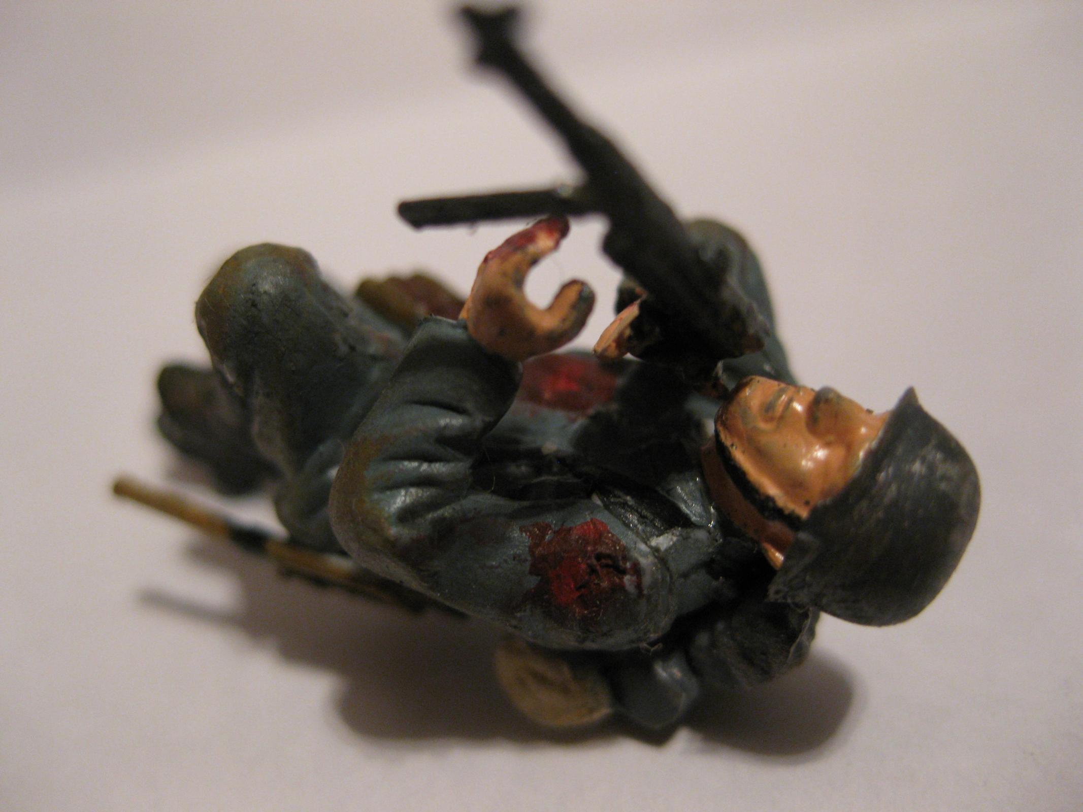 Интересная динамичная поза.Судя по всему получил штыком в пузо, так что пятна крови не на месте. Вообще лучше смойте краску и как следует доработайте фигурку: замажьте стыки, подшкурьте и перекрасьте, особенно лицо. Сам периодически балуюсь конверсизмом