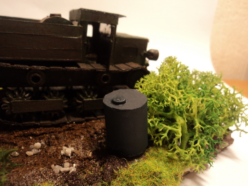 Основа:фанерка 5мм,Старая манка перемешанная с пва для грунта,трава это флок.Кустарники это крашеный олений мох.Касаемо армейского тягача,то он весь из картона.Бочка тоже из картона.