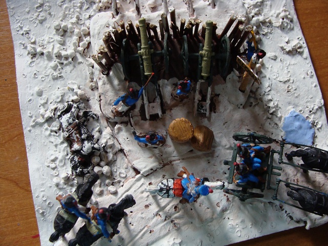 Хотя поразглядывал, порассматривал и сразу есть замечания. Первое: снег надо делать(самое простое - сода на клей ПВА),а не просто покрывать поверхность краской. Второе: это собственно укрепление. Складывается впечатление, что лошадь на диораме пала от того, что её замучили, пока волокли на позицию гигантский плоский валун, при выдалбливании укрытия в котором пала большая часть личного состава расчётов. И указатель (у меня, как Вы понимаете, тут особый интерес): его не видно. И что он делает на огневой? Может, попробовать переработать? Главное - не опускайте руки. Я свою первую диорамку отдал маме и теперь жалею: она поставила её на видное место и всем показывает, какой у неё гениальный мальчик(сорока лет от роду!)Стыдно, но зато отрезвляет. Удачи, Никита!