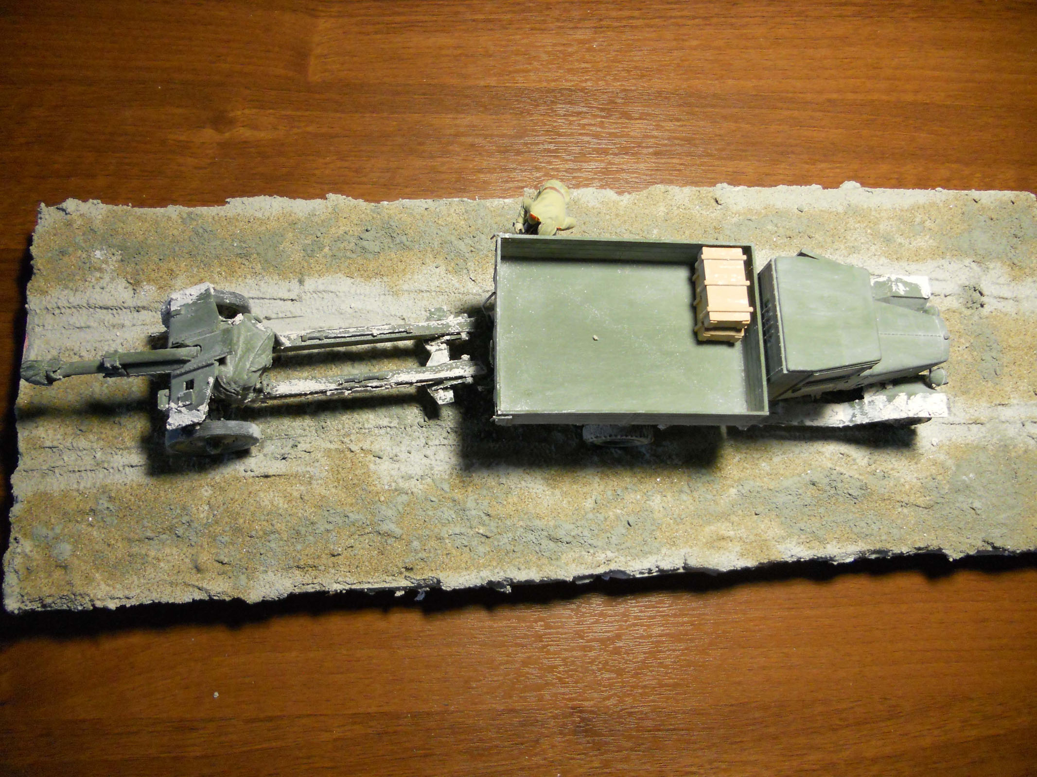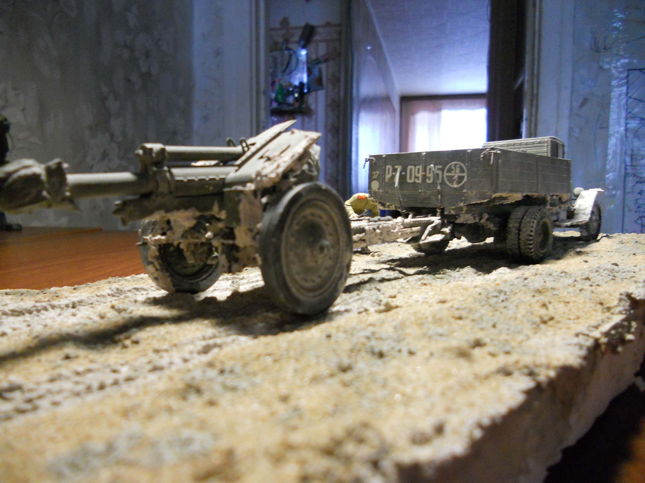 Маштаб модель 1:35 "ЗиС-5В" и "Гаубица 122мм М-30", модели фирмы "Звезда", красил акриловой краской фиры "Звезда". Использован материал для основания песок, цемент, шпаклевку.