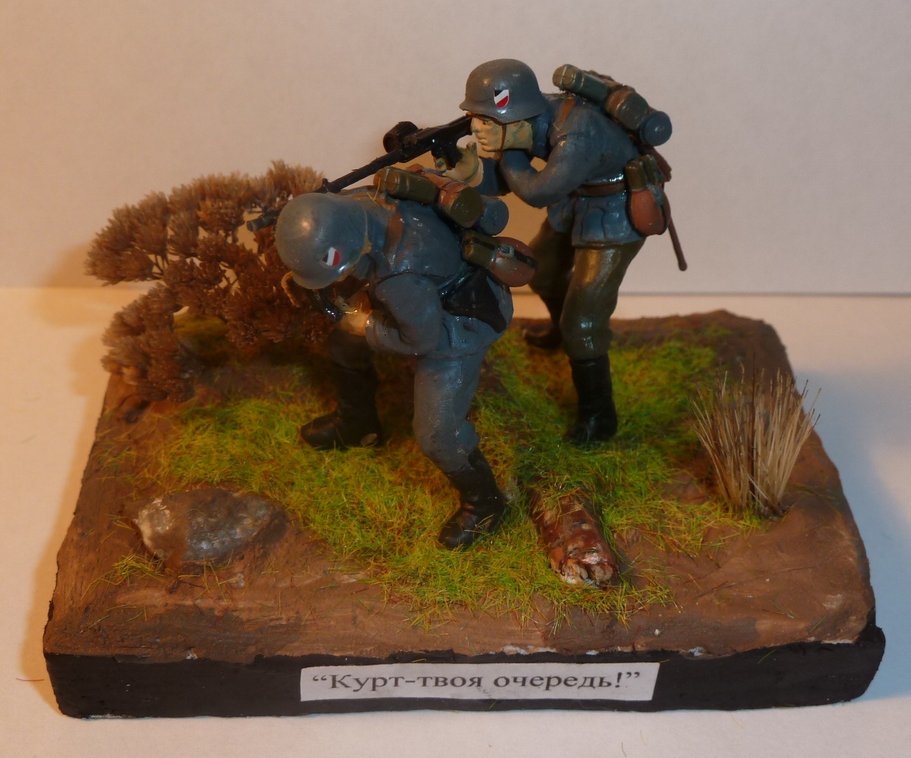 1. краткое описание работы –фигурки TAMIYA пулеметные расчёты, разбитая каска фирмы ТАНК, основа пенопласт, рамка из реек ,земля гипс окрашенный красками ЗВЕЗДА, высокая трава кисть,(кустарник ,бревно дар природы) ,модельная трава фирма ЗВЕЗДА