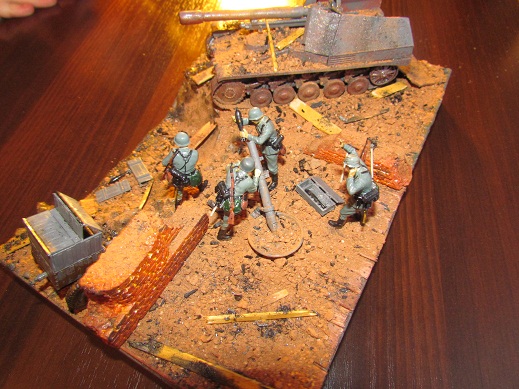 Использовал Набор немецких миномётчиков от "Звезды", самоходка от фирмы "ark models". Самоходку собрал ещё в глубоком детстве и разумеется успел много раз сломать, но когда стал подумывать о диораме, то пришлось восстанавливать её почти с нуля, а именно: заменил гусеницы, броневые листы, ствол пушки. Краски: ржавчина от "Звезды", местами обычная акварель , форма солдат- машинная грунтовка. Основание сделано из простой коробки, воронка- пенопласт, залитый клеем пва с содой и песком, развалины- ренопласт, местами брусчаска из скульптурного пластилина, мусор- крошка кирпича, палочки из под эскимо.