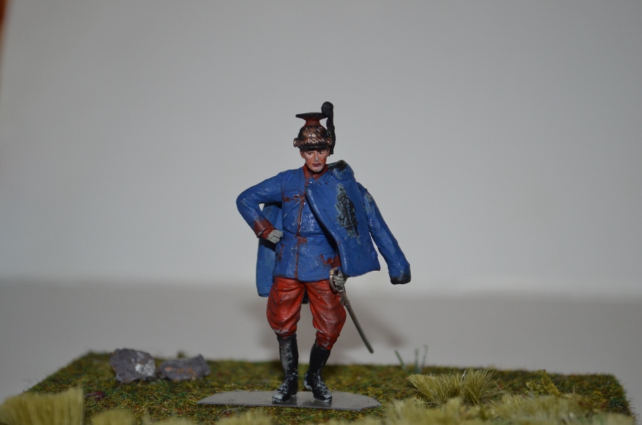 У стреляющего из винтовки драгуна (из-за убитой лошади) каска всё ещё мирного времени. Должна быть уже перекрашена в серый цвет - как у того, что с пикой.
