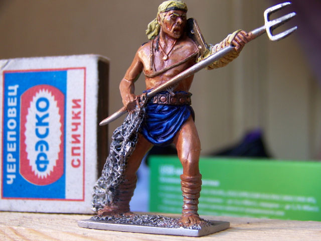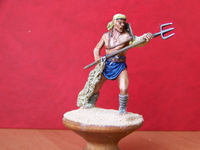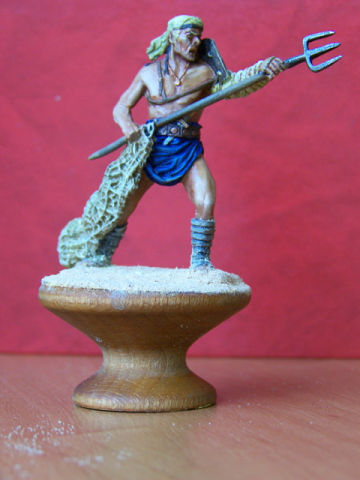 Прошелся лессировкой по "юбке" гладиатора (прошу извинить, правильного названия не знаю), кажись стала какой-то грязной. Добавил высветлений по коже. Покрасил трезубец. Начал работу над обмотками на ногах. Жутко смущает сеть - блямба какая-то. Руки чешутся её спилить и сделать настоящую. Вот только боюсь испортить фигурку. У кого-нибудь есть опыт такой конверсии? Подскажите. Хотелось бы выслушать мнения и по всей проделанной работе.