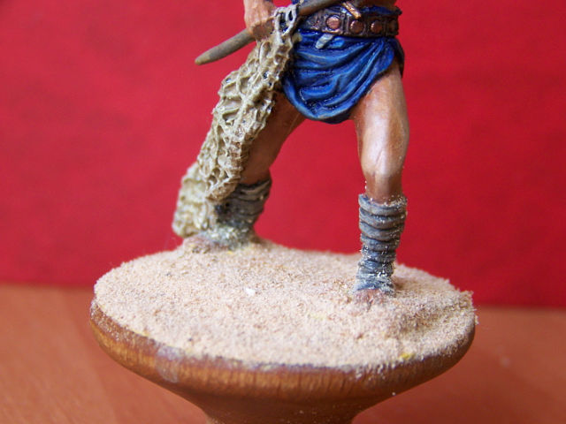 Работа над гладиатором ретиарием закончена. Парень обзавелся "пьедесталом" и песочком (слава богу не в почках). Подставка самодельная. Без зазрения совести была уничтожена "шишка" от деревянного карниза. Из неё, кстати, получилось аж две подставочки под миниатюры. Песок - это мелкие опилки оставшиеся после распила "шишки". Прошу к обсуждению.