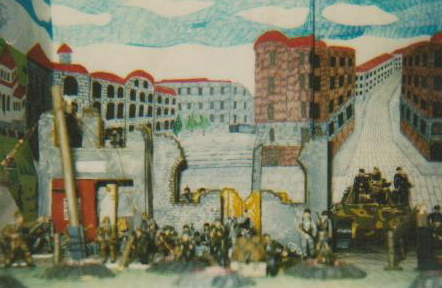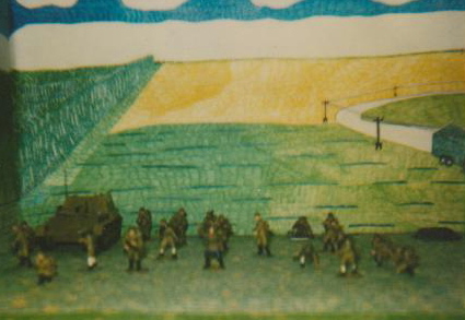Решил и я выложить свою диараму. Изготовил её в 1994-1995 годах. При переезде она естественно не сохранилась А фото сделанные палароидом остались. Миниатыры солдат покупные из пластмассы фирмы "Звезда".Сборка,покраска и ландшафт сделаны самостоятельно. Одно несоответствие. Экипаж немецкого танка (Тигр) а фактически танк (Пантера)