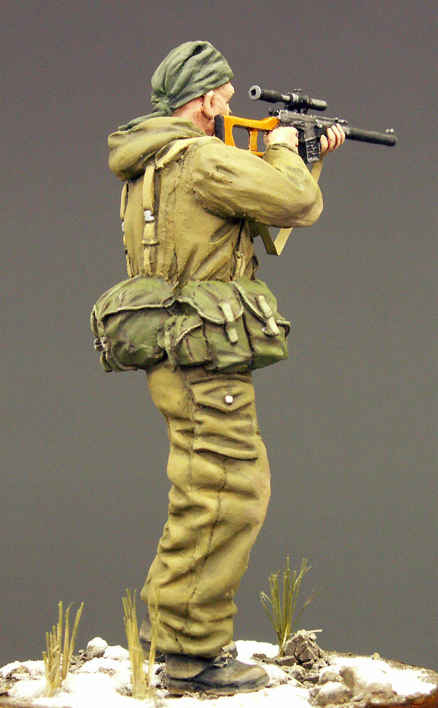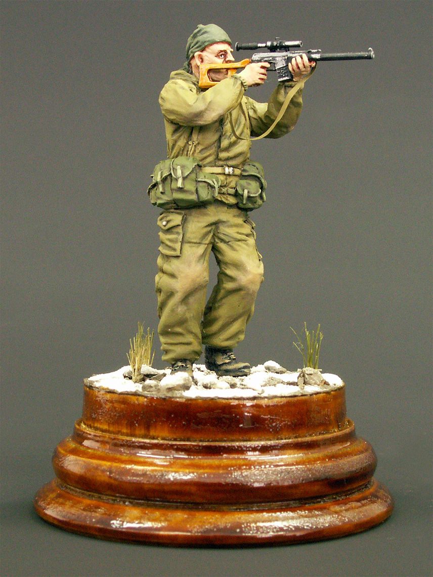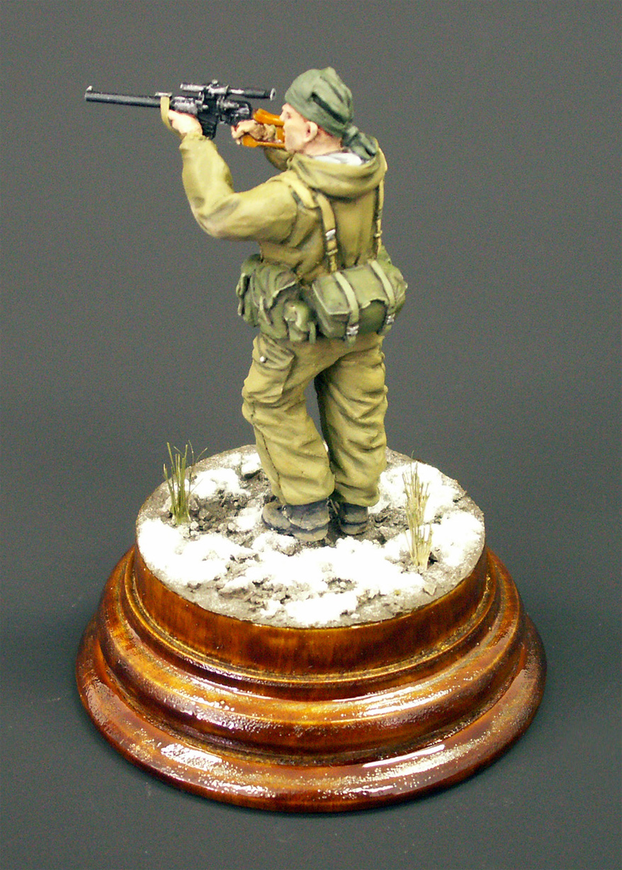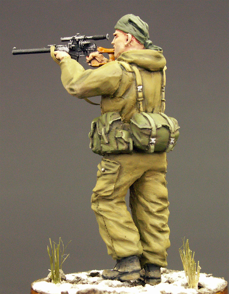 Проработка фигурки, в целом, хорошая. Единственный косяк, который заметил уже после покраски – неверное положение рук заданное производителем. Руки нужно было спиливать в местах локтевого сгиба, заделывать шпаклевкой и приклеивать заново, а также исправлять положение кистей, чтобы линия прицела находилась на уровне глаз снайпера. Решил изобразить момент вскидывания винтореза бойцом. Еще миг – и он прильнет к прицелу.