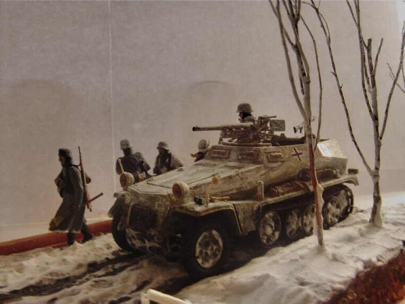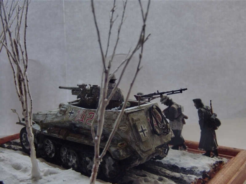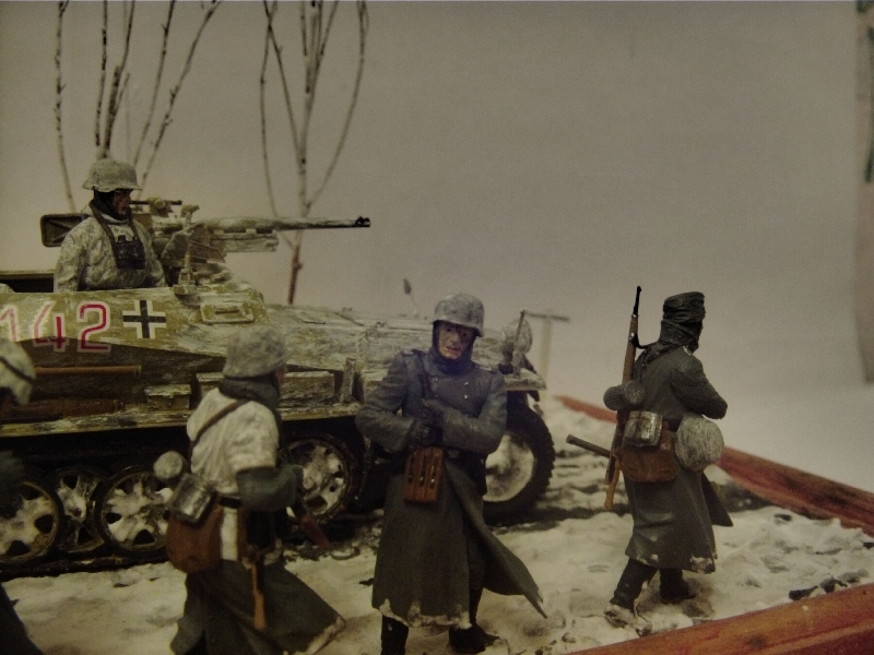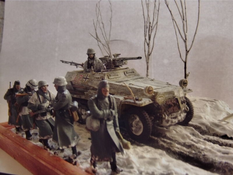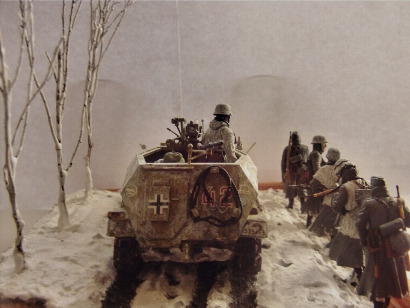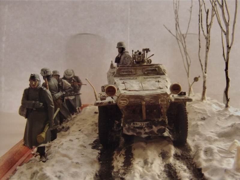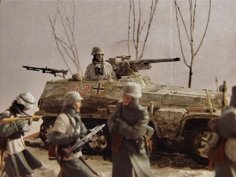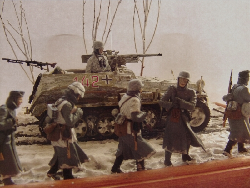 Здравствуйте коллеги. Представляю на ваш суд свою мини диораму наступления в Арденнах 116-й танковой дивизии. Масштаб 1/35 Бронетранспортер от Tamiya (переделан из Sd.Kfz.250/9 в Sd.Kfz.250/10) орудие от Звезды, фигуры в Sd.Kfz.250/10 от MiniArt, фигуры идущие рядом от Master Box. Основание пенопласт, снег сода деревья от природы. Пачкал гуашью и пастелью. Это моя первая проба зимней диорамы. За комментарии заранее благодарен.