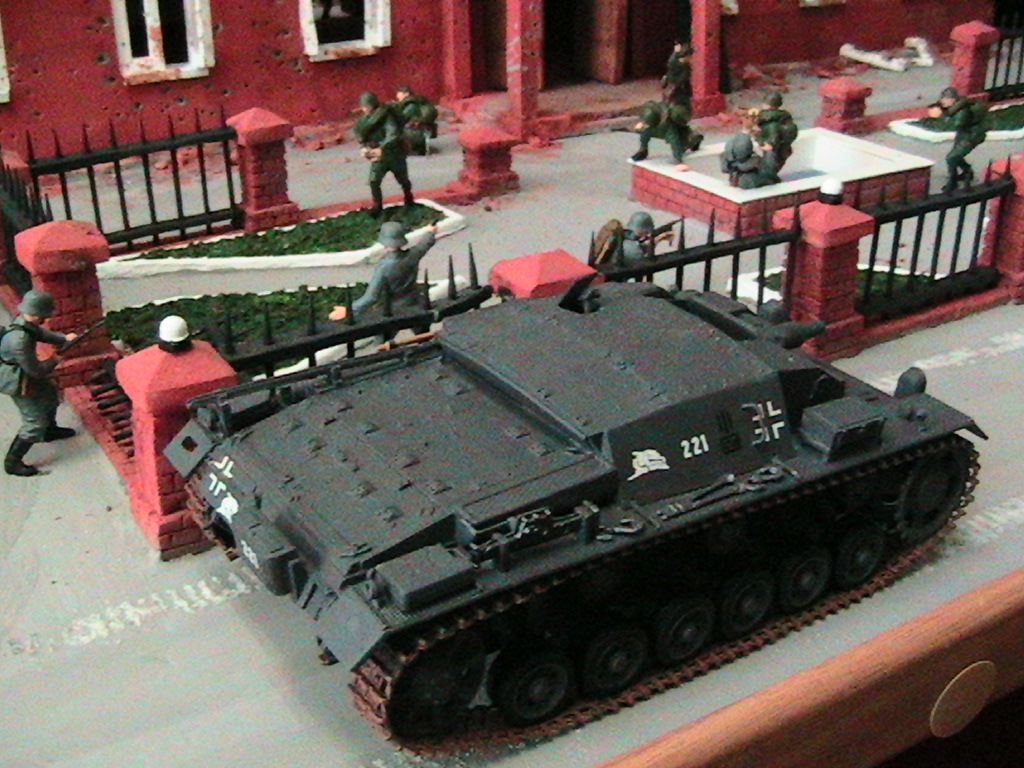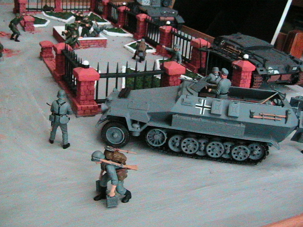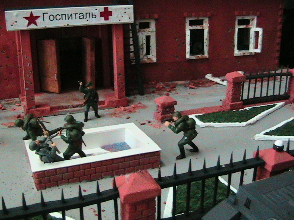 Ну суть диарамы в том что вначале госпиталь обстреливал танк, а потом подошлел бтр с немцами и они стали штурмовать, наши решили не дожидать и пошли в атаку.С тонировкой и грязью - буду учиться...