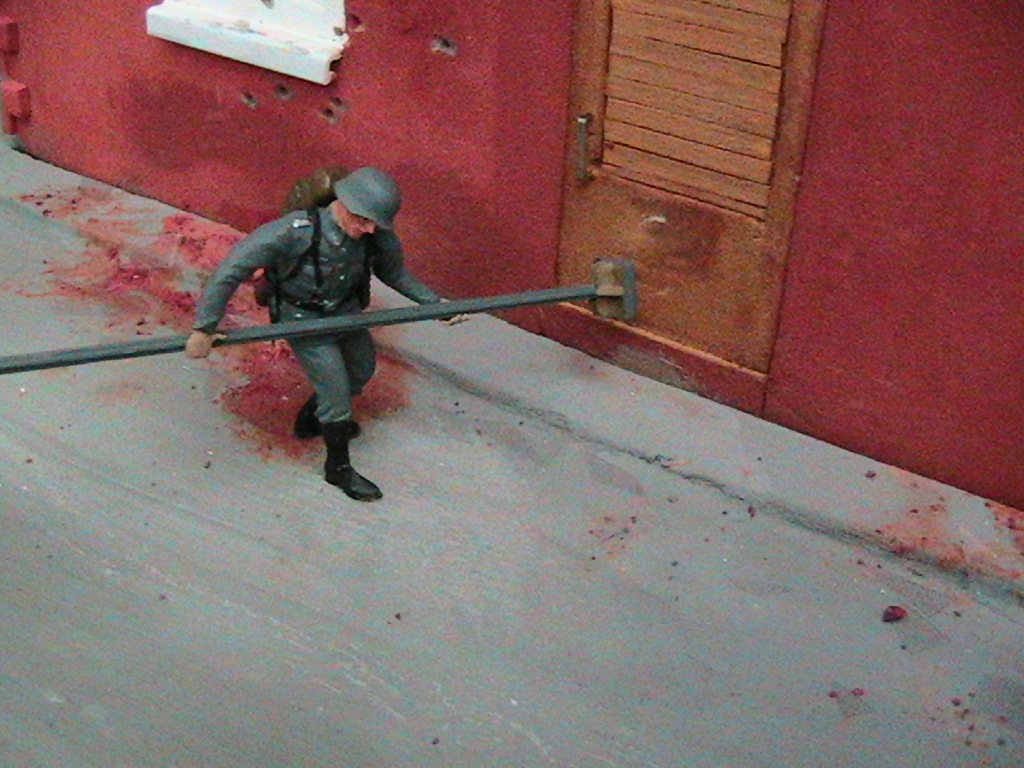 неплохая задумка, загрязните диорамку сильнее( кирпича накидайте, солдат поваляйте в пыли) и неплохо выйдет. Что касается кирпичного цвета, то действительно как то не реалистично, ещё бы деревьев посадить кое-где и хорошо будет, удачи!