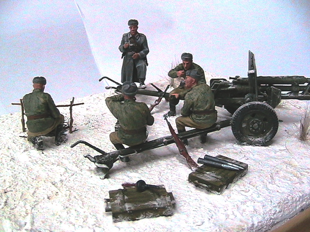 Александр, мне очень понравилось. Одно НО - судя по наличию гильз пушка стреляла, а следов отката орудия на снегу нет. Я полагаю, что ещё не поздно у станин сделать небольшие углубления и кучки из снега и грунта.