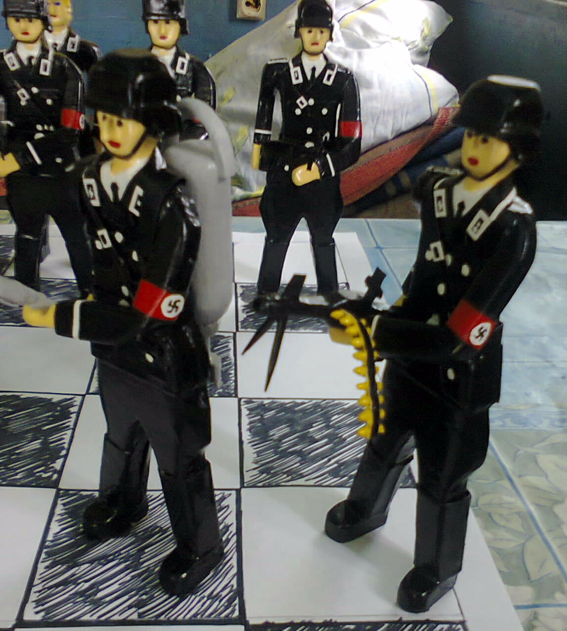 Решил попробовать сделать немного более осовремённый комплект шахмат. В качестве противоборствующих сторон выбрал войска СС Германии и советские войска.Пока сделал только одну "армию". Работа длилась 58 дней. Вместо короля - естественно Гитлер. Ферзь (она же королева) естественно женщина (фюрерина из вспомогательных частей СС).Слоны - офицеры. Вместо ладьи - решил сделать пулеметчика ( тяжелая все таки фигура) Вместо коня - огнеметчика (огонь везде проникнет. В дальнейшем с советской стороны будет точно так. А вместо короля я планирую сделать Сталина. А что сейчас получилось смотрите сами.