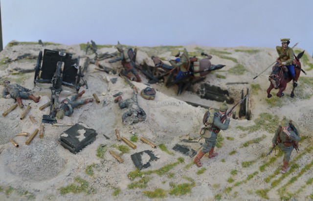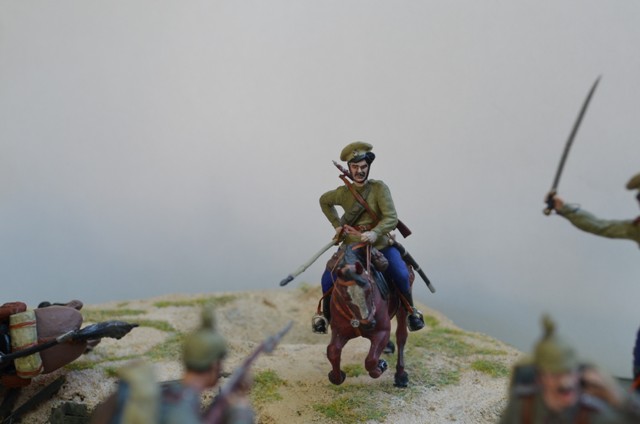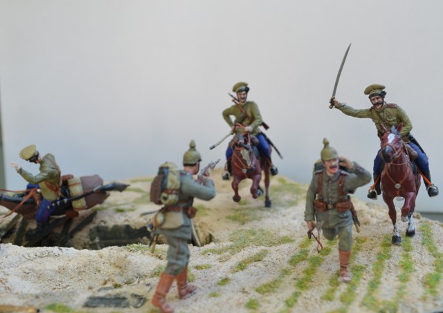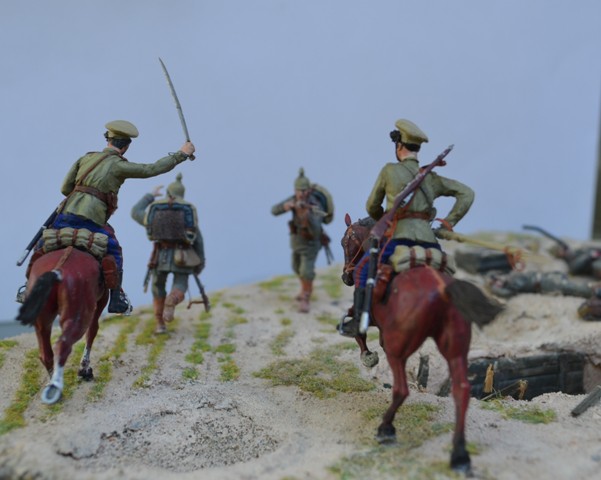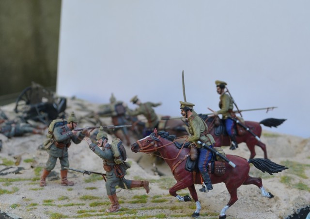 В целом очень даже неплохо. Только на мой взгляд многовато пустого пространства на диораме. И всего два скачущих казака не дают представления о всесокрушающей казачьей лаве. Мало казаков!!! Немцев тоже можно было бы прибавить - зарубленных, просто упавших, и убегающих. Потому как именно казачья атака, её динамика и экспрессия, и есть главный драматический момент всей работы. А вот пушка и её побитый расчёт выглядит несколько излишне. Упавший вместе с лошадью казак тоже как-то "отрывается" от основного сюжета - его бы поместить сзади скачущих хотя бы.