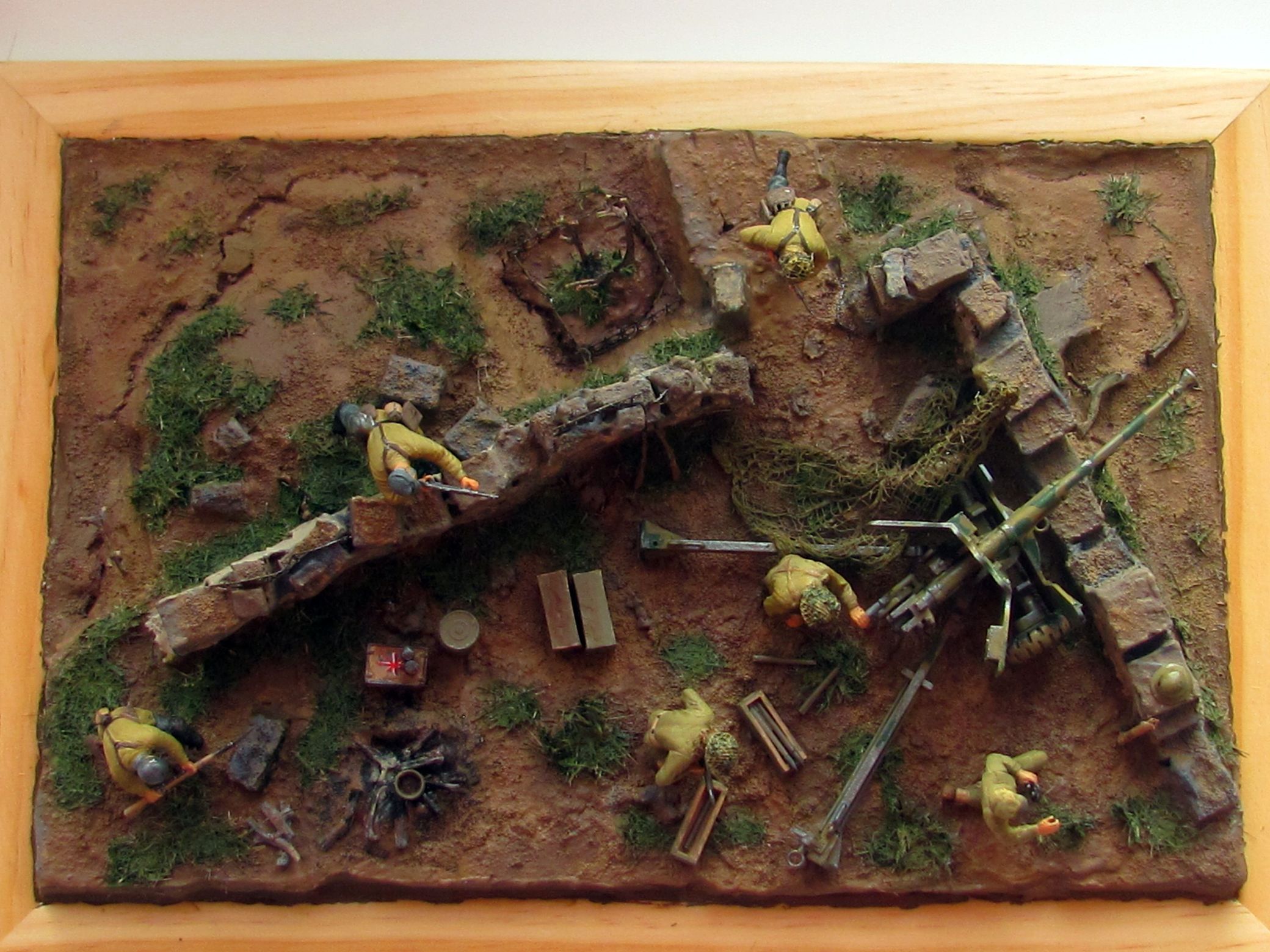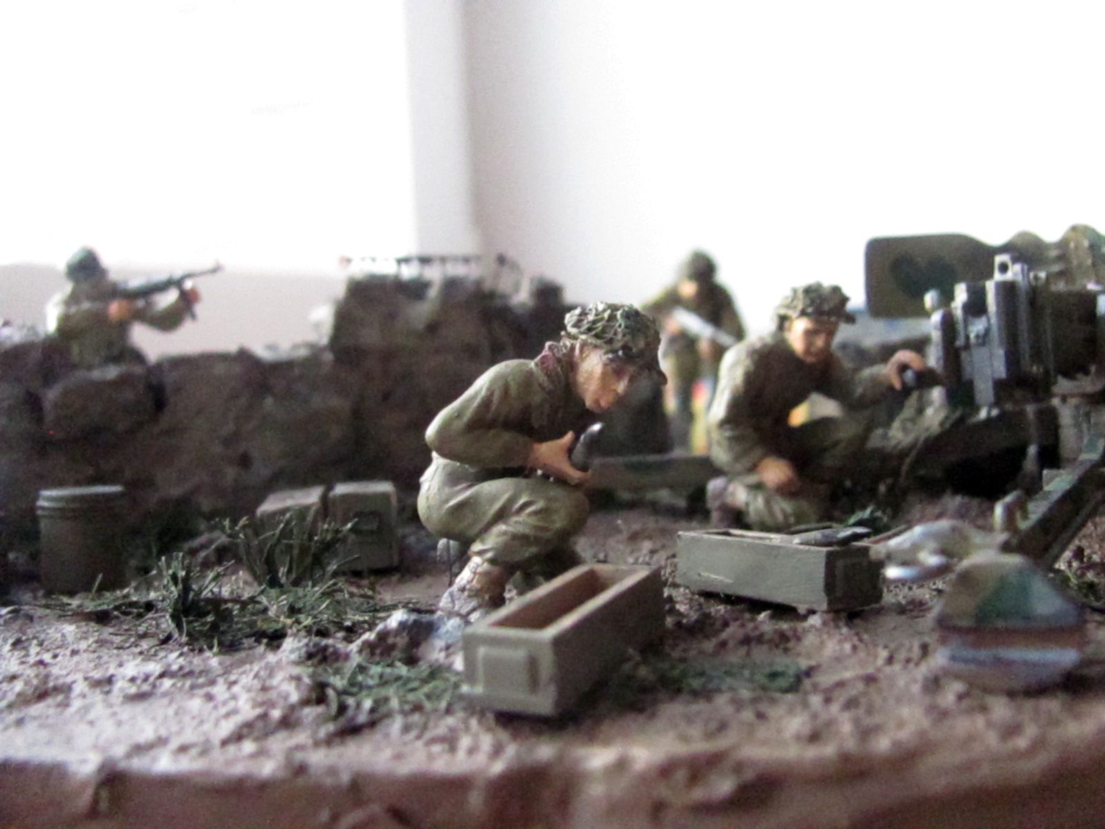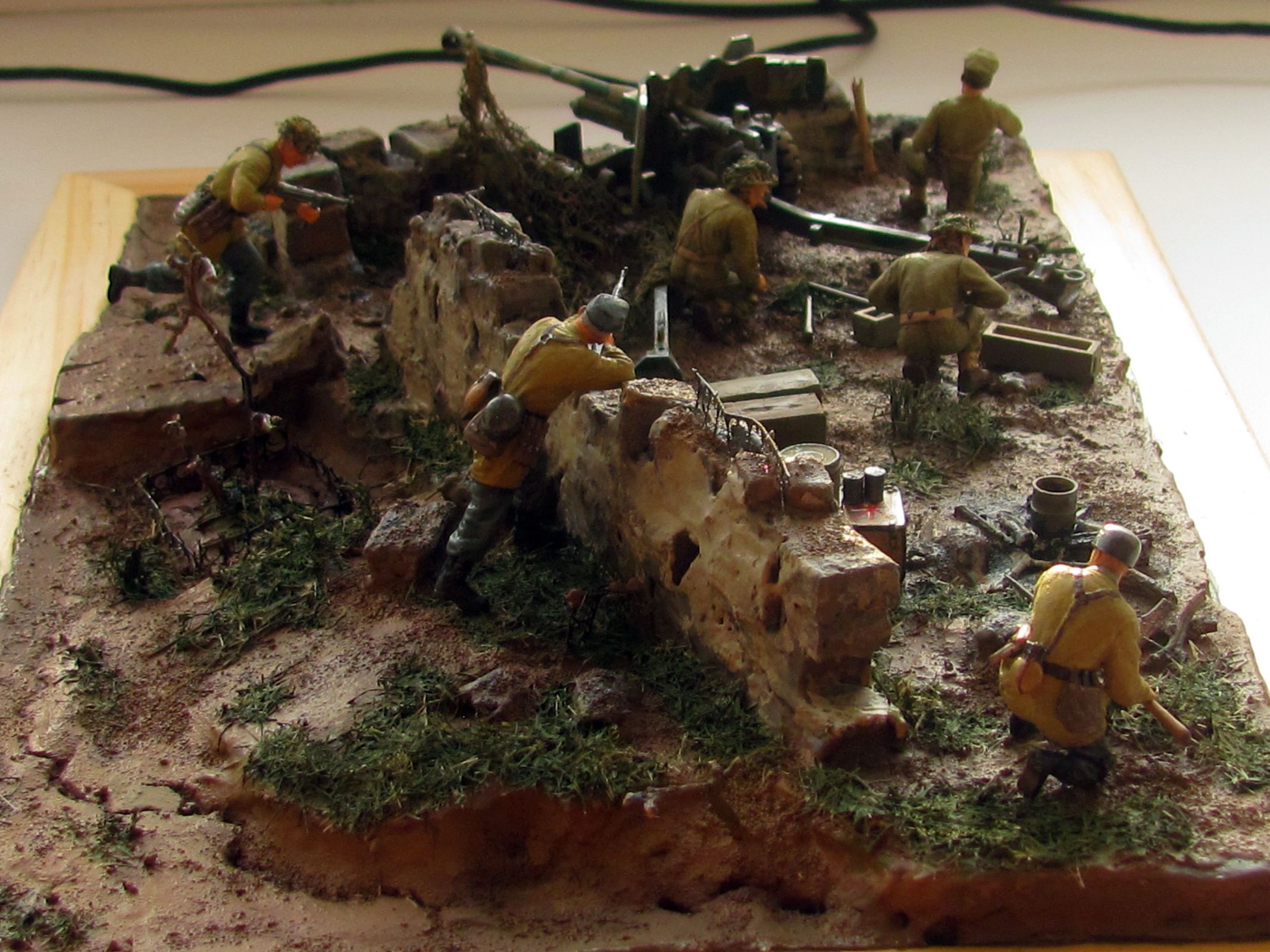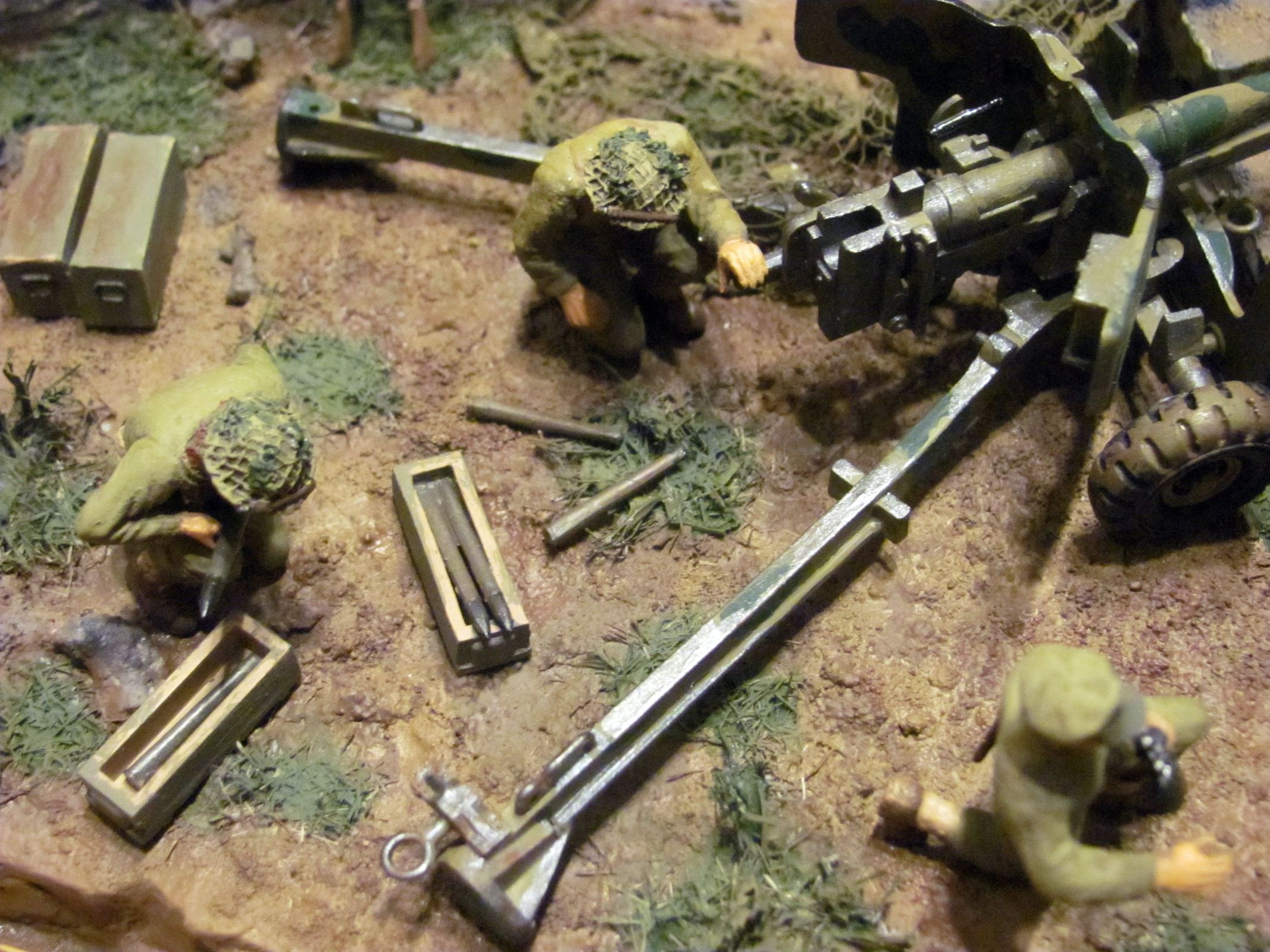 При изготовлении работ с использованием арт. установок учитывайте, что орудие у Вас установлено не на бетоне (при стрельбе на грунте остаются характерные следы от колёс и упоров). Кроме того, имеющие мозги артиллеристы никогда не оставят маск. сеть на подвижных частях, тем более одной стороной зацепившуюся за неподвижный объект (у Вас, кажется, из стены торчит арматура), это чревато неприятными последствиями.