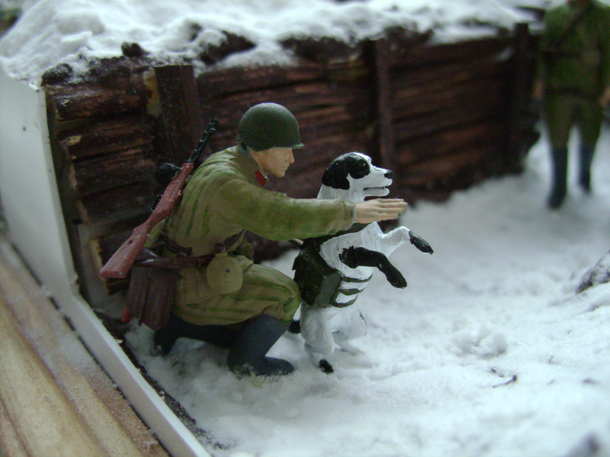 Я сказал своё мнения от увиденного,а увидел я тут следующее,бойца красной армии,который через секунду пристрелит собаку которая будет хаотично метаться пот его автоматным огнём.(Что бы избежать такого спорного момента я бы просто поменял композиционное решения).А его товарищ в этот момент вальяжна идёт собакой на поводке как будто во дворе с утра перед работай пёсика выгуливает,хотя вроде как идёт бой